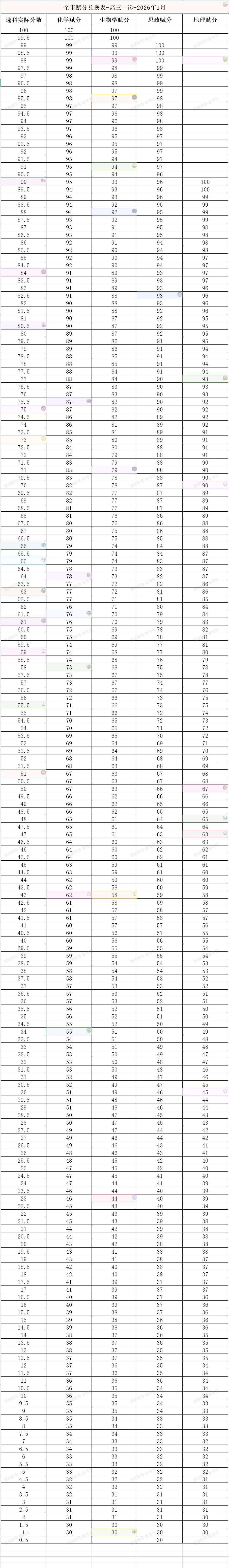 由2026年重庆九龙坡一诊赋分表可知,在新高考赋分规则下:化学原始分93、生物原始分92,能赋100分;化学原始分70、生物原始分77.5、政治原始分66、地理原始分73,能赋90分;化学原始分54、生物原始分67、政治原始分54.5、地理原始分63,能赋80分。