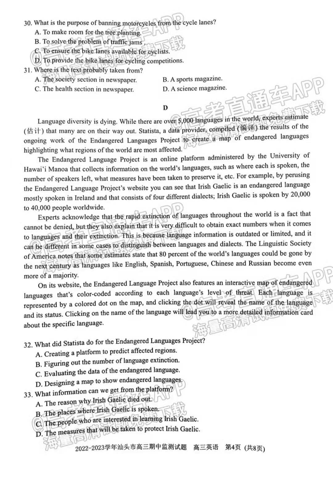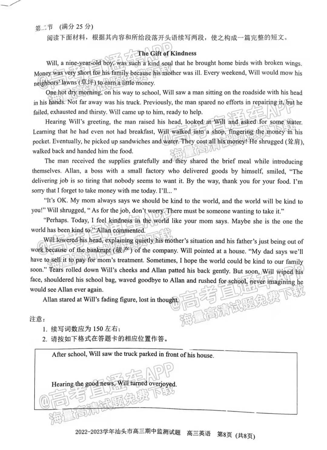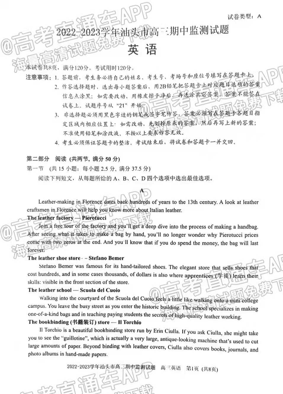 目前2023广东汕头高三10月市统考英语试卷已更新,具体试卷情况如下,如果大家想要了解更多试卷内容,可以进入高考100网进行查看,本试卷共8页,仅供参考。