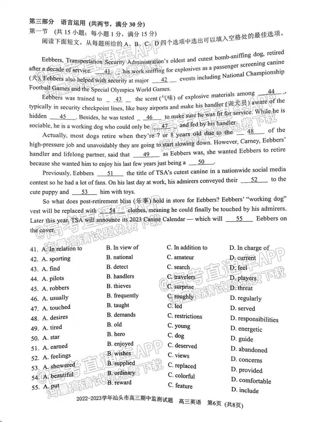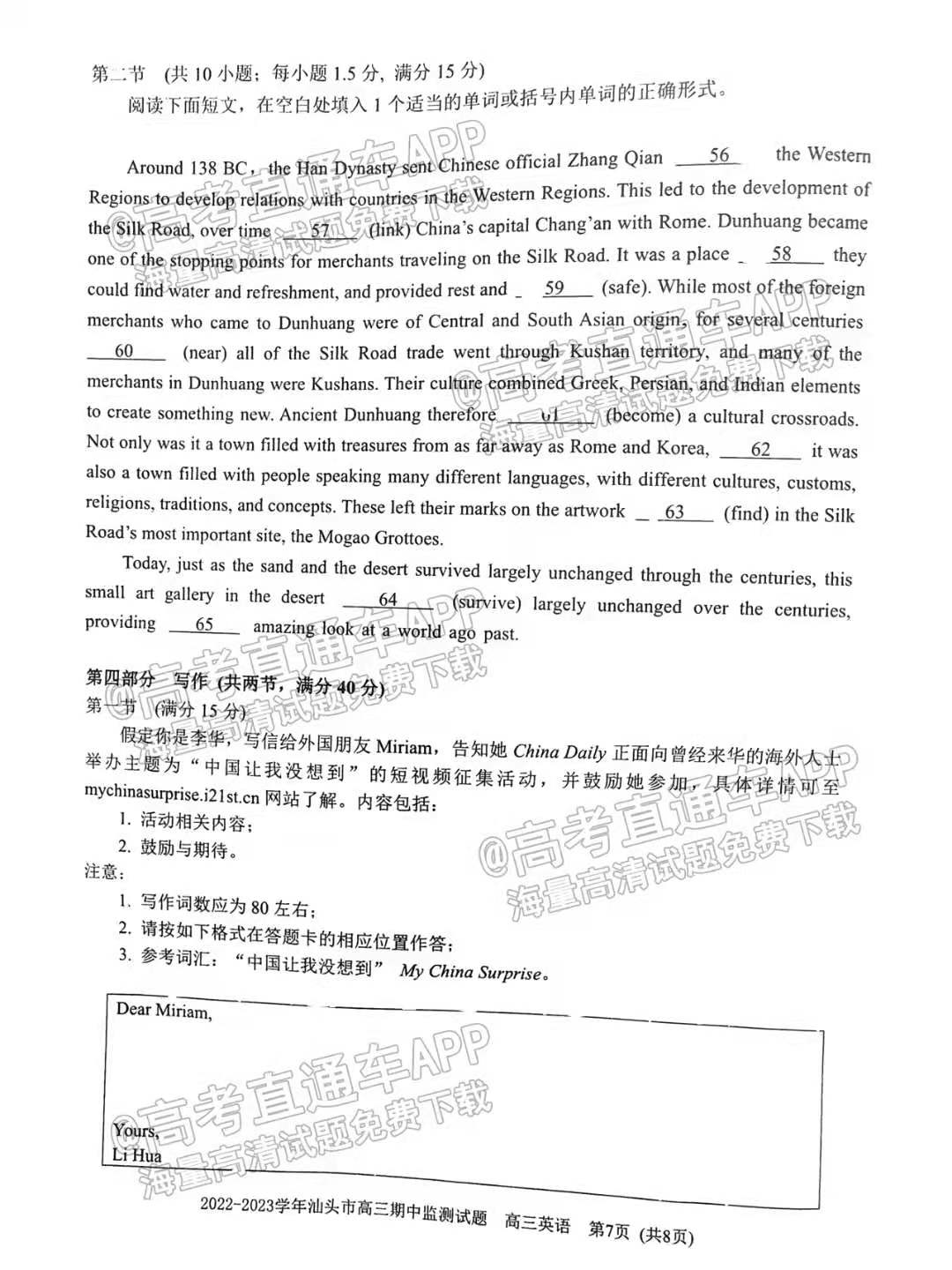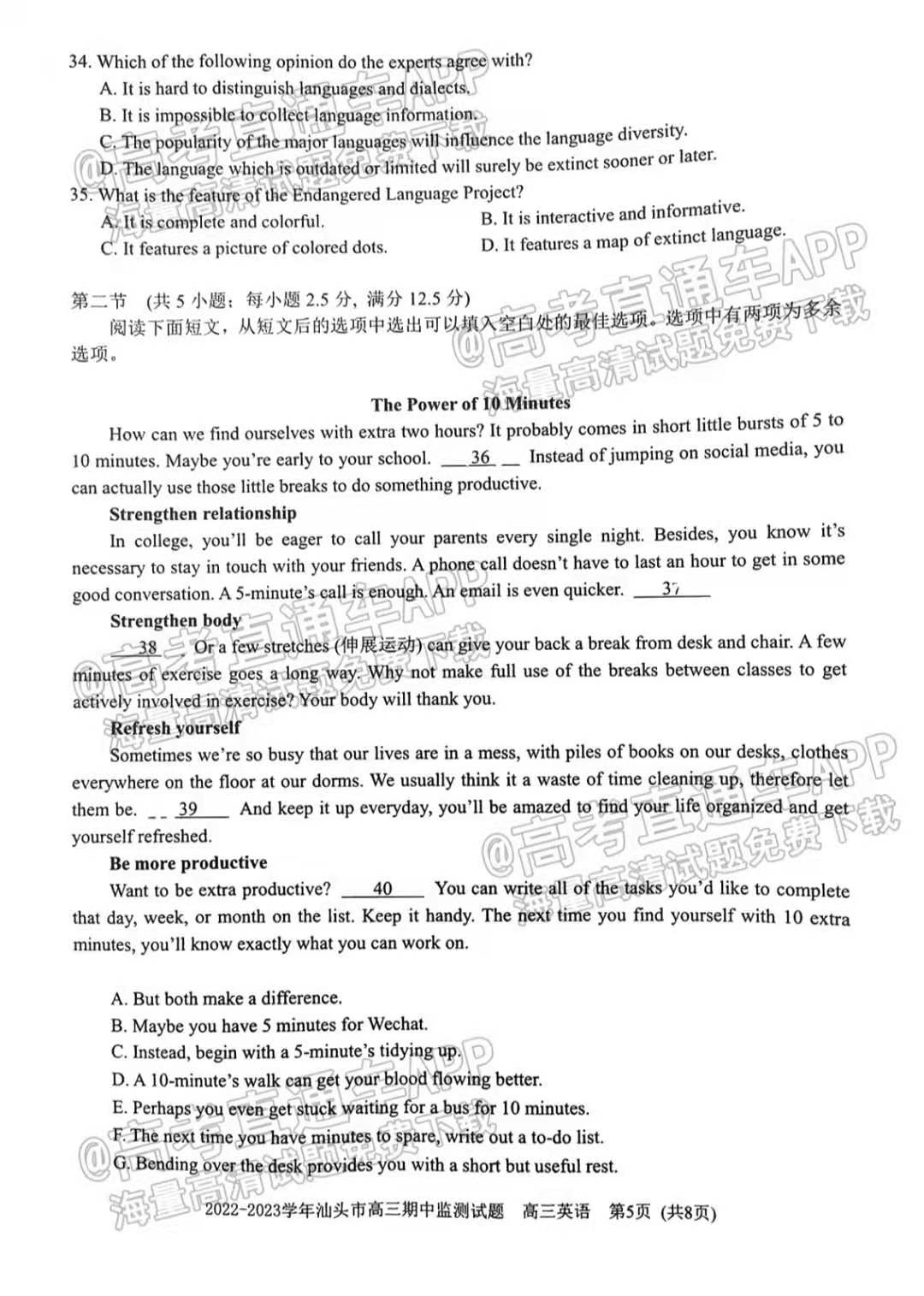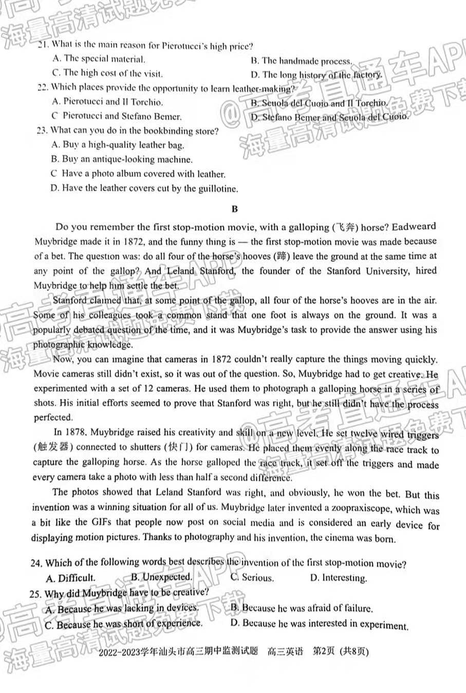 目前2023广东汕头高三10月市统考英语试卷已更新,具体试卷情况如下,如果大家想要了解更多试卷内容,可以进入高考100网进行查看,本试卷共8页,仅供参考。