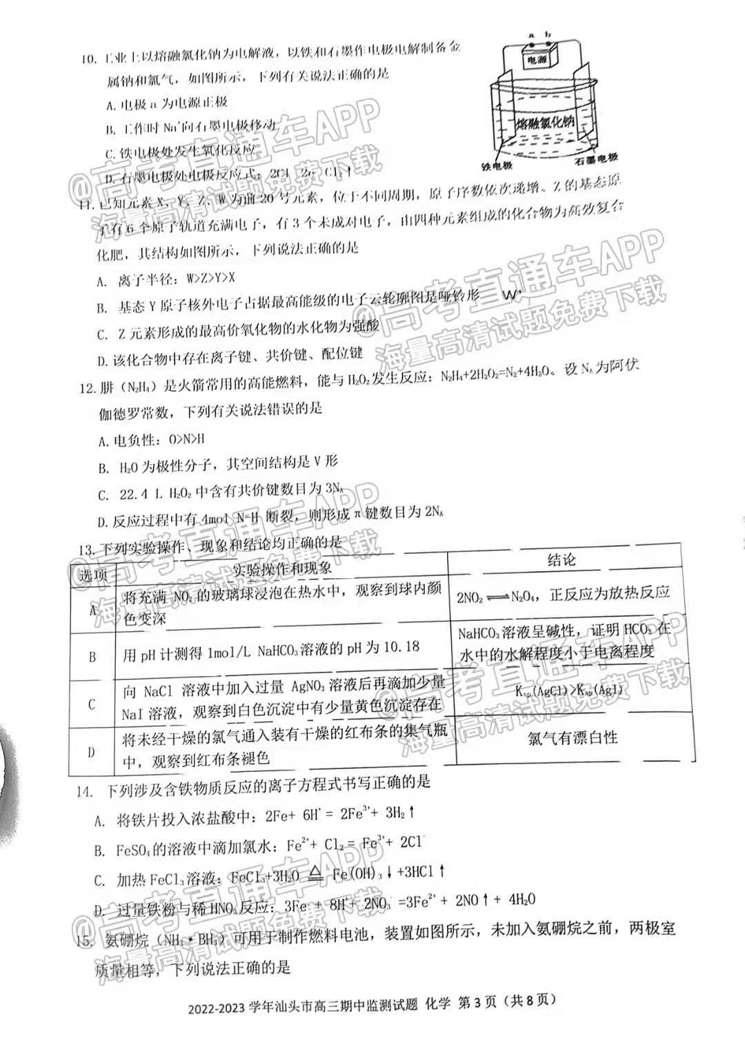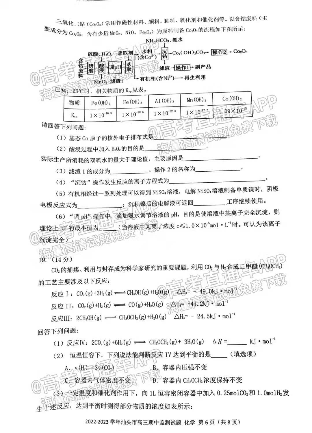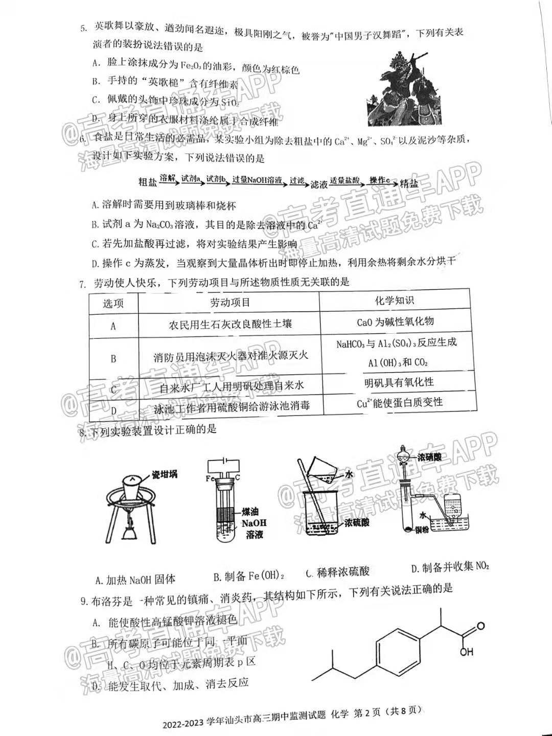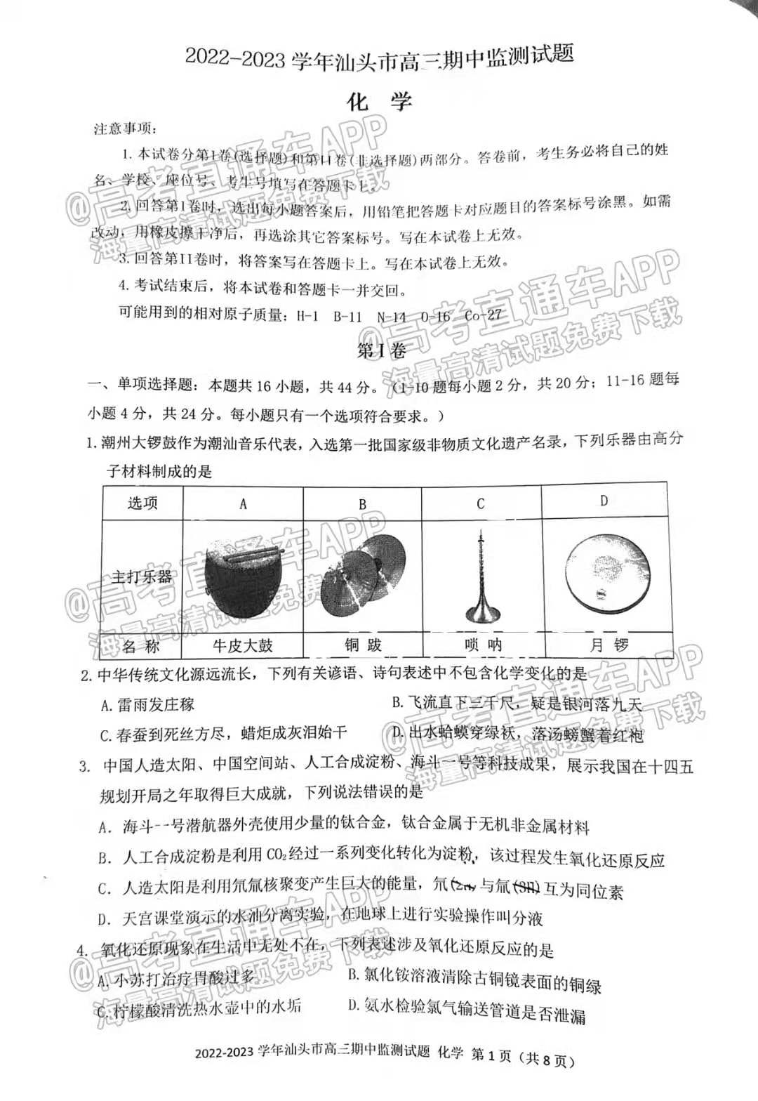 目前2023广东汕头高三10月市统考化学试卷已更新,具体试卷情况如下,如果大家想要了解更多试卷内容,可以进入高考100网进行查看,本试卷共8页,仅供参考。