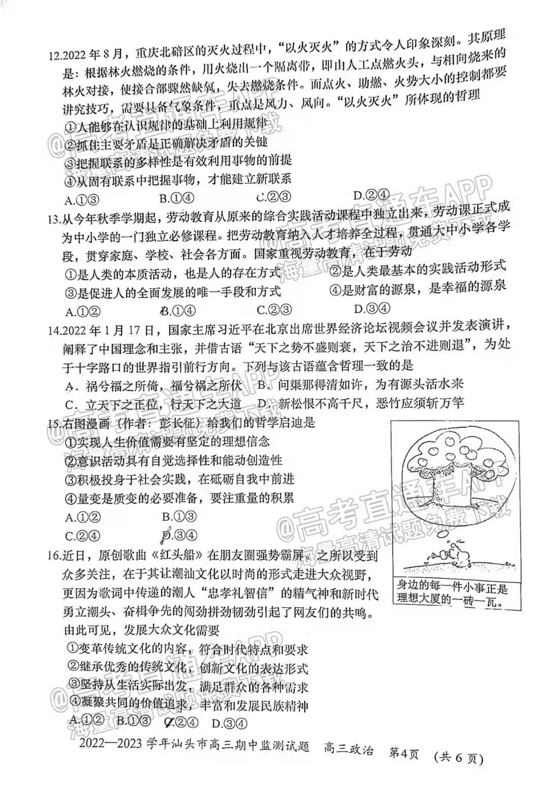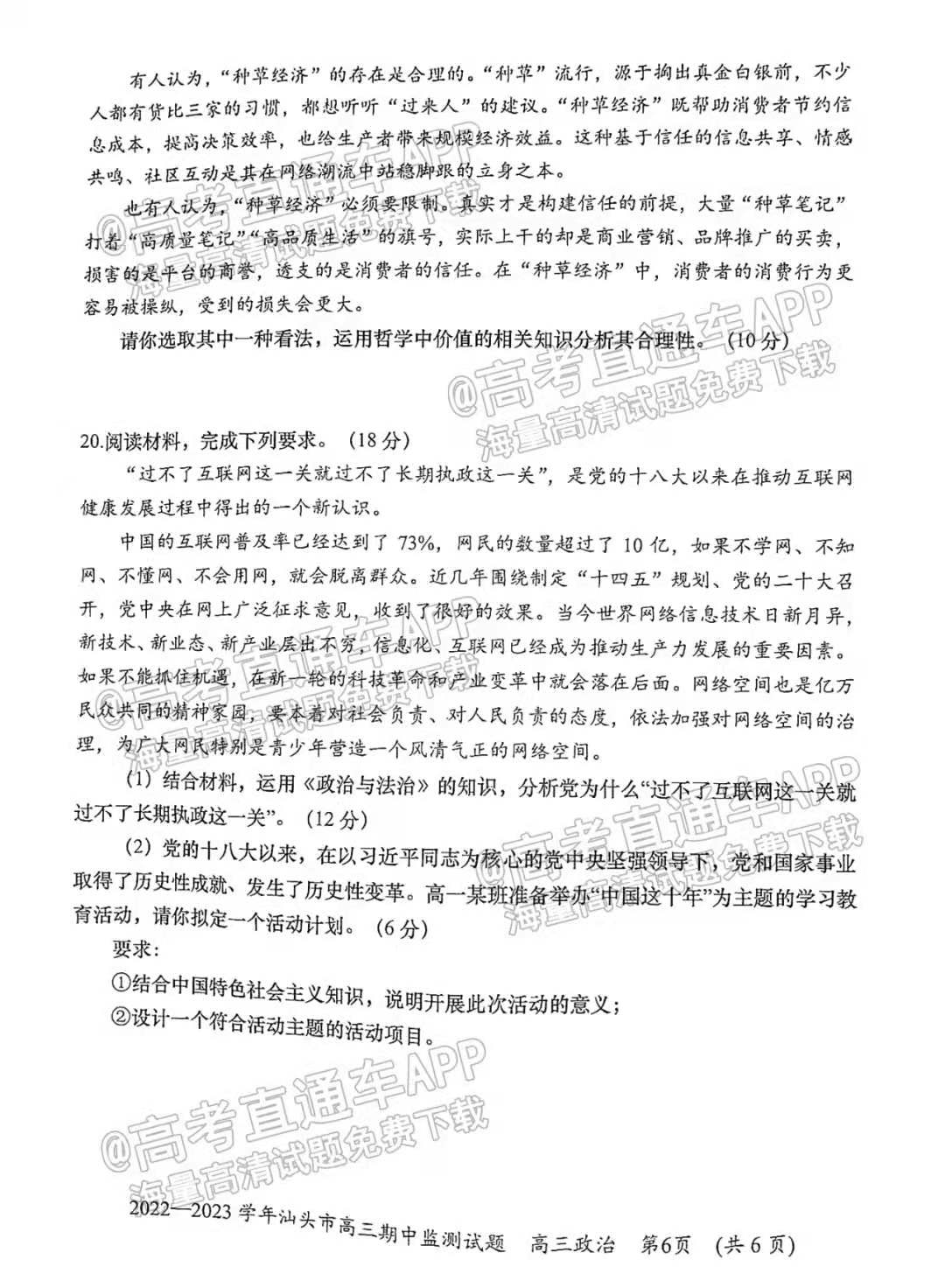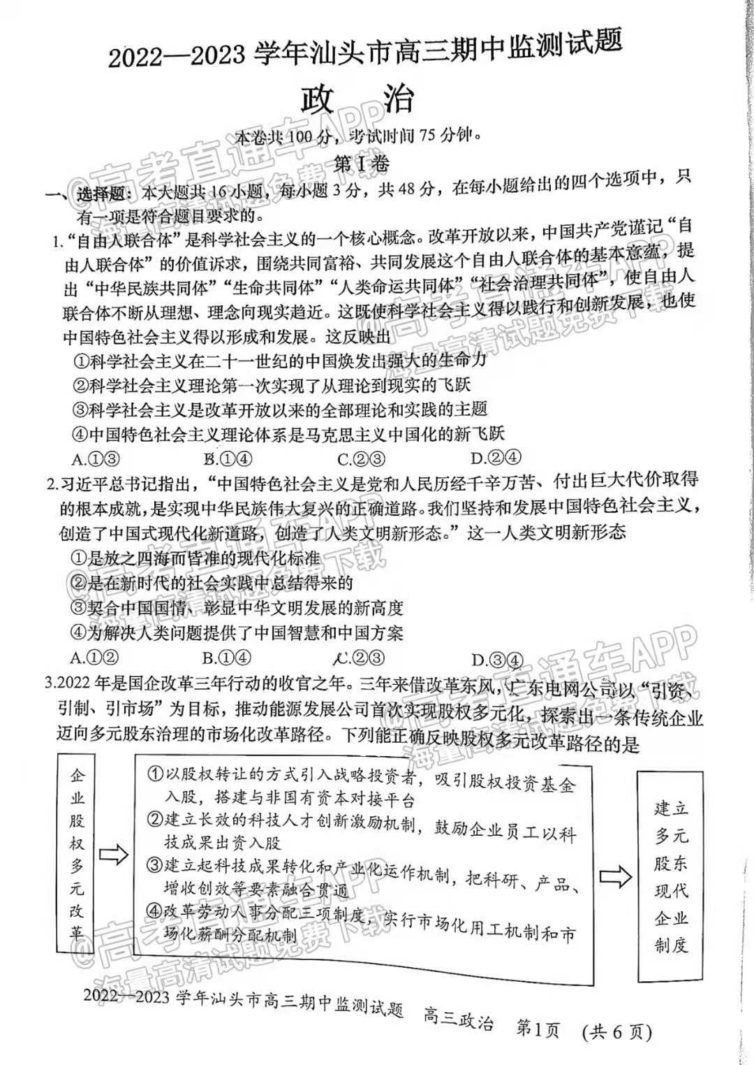 目前2023广东汕头高三10月市统考政治试卷已更新,具体试卷情况如下,如果大家想要了解更多试卷内容,可以进入高考100网进行查看,本试卷共6页,仅供参考。