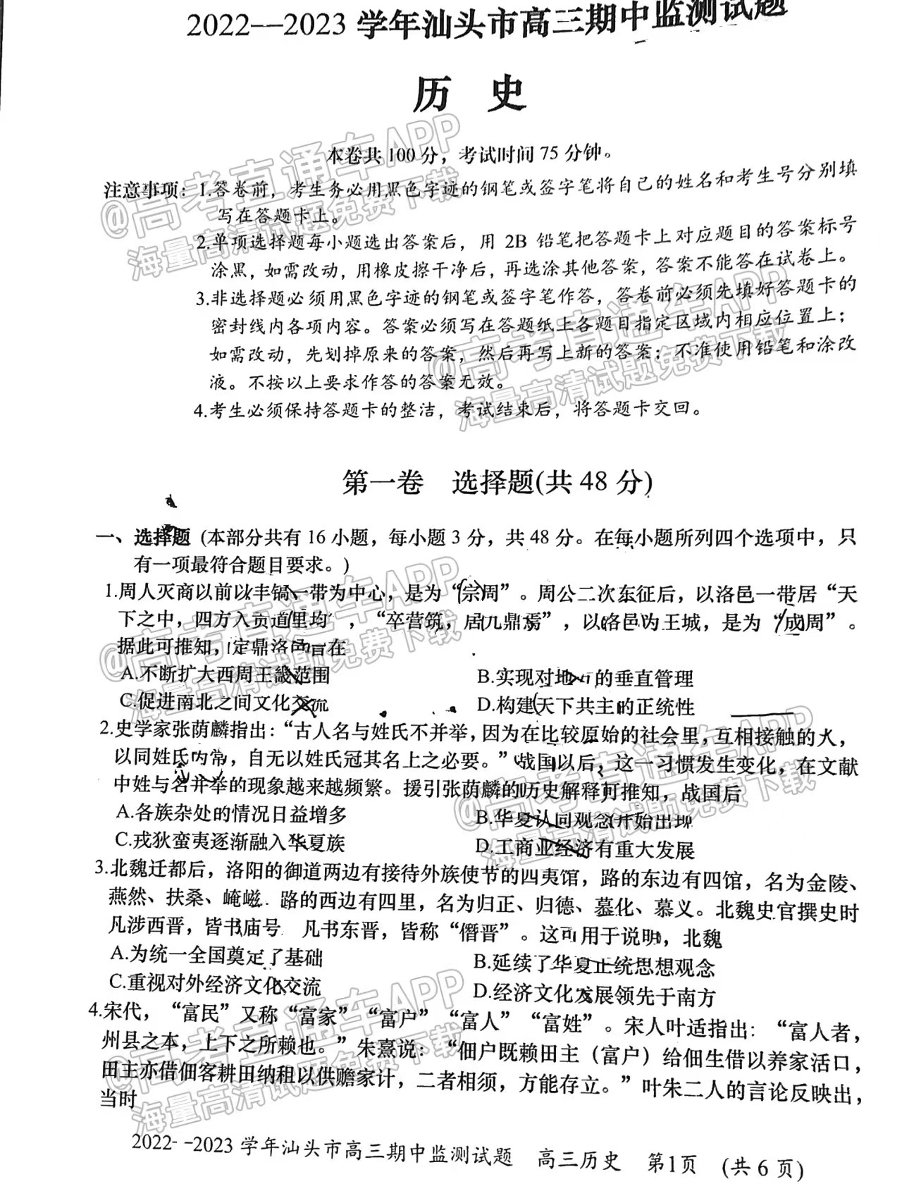 目前2023广东汕头高三10月市统考历史试卷已更新,具体试卷情况如下,如果大家想要了解更多试卷内容,可以进入高考100网进行查看,本试卷共6页,仅供参考。