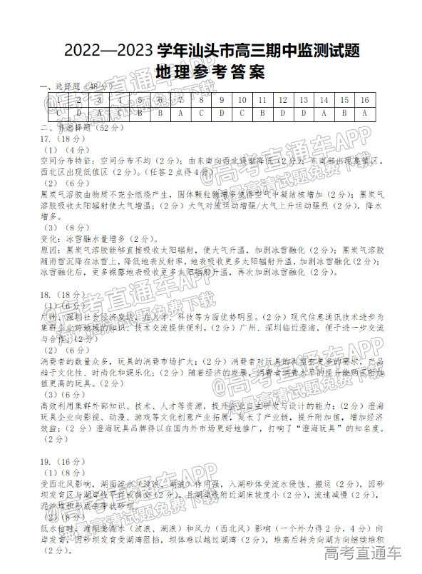 目前2023广东汕头高三10月市统考地理答案已更新,具体答案情况如下,如果大家想要了解更多试卷内容,可以进入高考100网进行查看,本答案共1页,仅供参考。