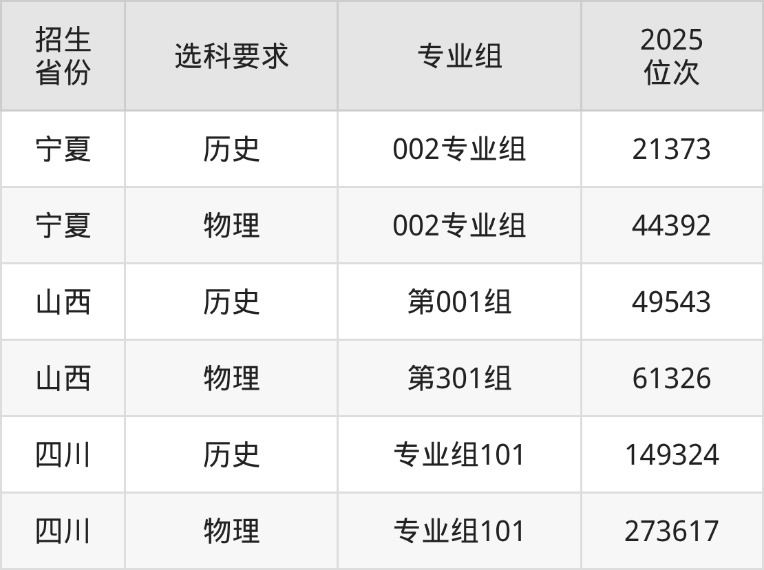 宁夏艺术职业学院2025年在全国各省的位次差异较大,最高位次是21373位(宁夏历史类)、最低位次是273617位(四川物理类)。各省具体位次请看下图: