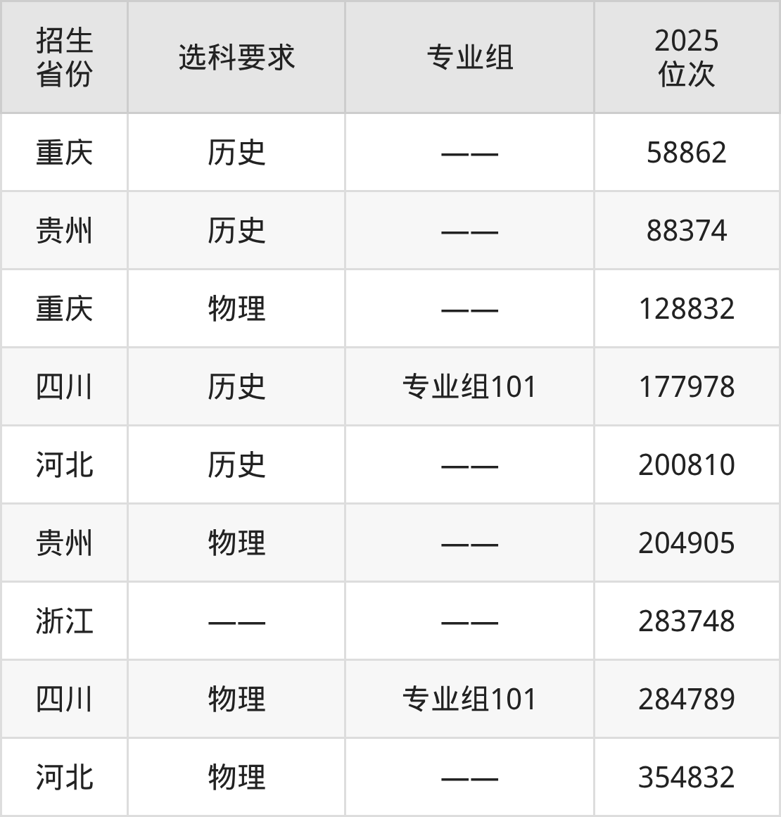 贵州工程职业学院2025年在全国各省的位次差异较大,最高位次是58862位(重庆历史类)、最低位次是354832位(河北物理类)。各省具体位次请看下图: