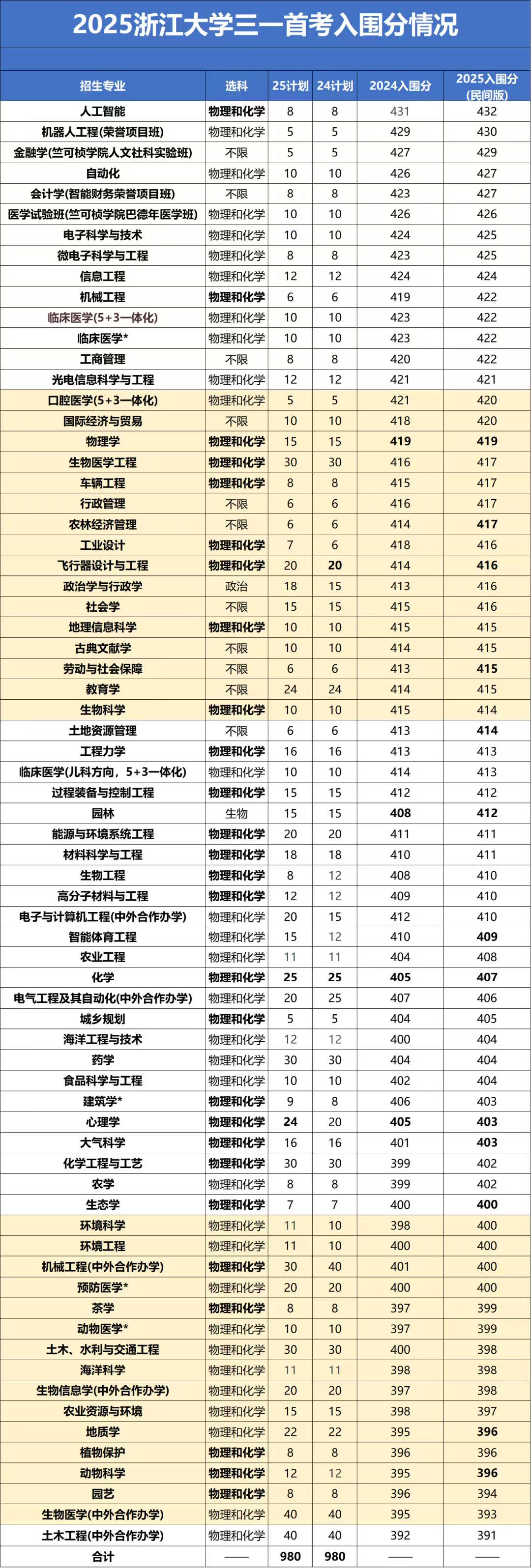 浙江大学2025年三位一体初审首考入围分数线最低的专业为土木工程(中外合作办学)391分,分数线最高的五个专业分别为人工智能432分、机器人工程(荣誉项目班)430分、金融学(竺可桢学院人文社科实验班)429分、自动化427分、会计学(智能财务荣誉项目班)427分。