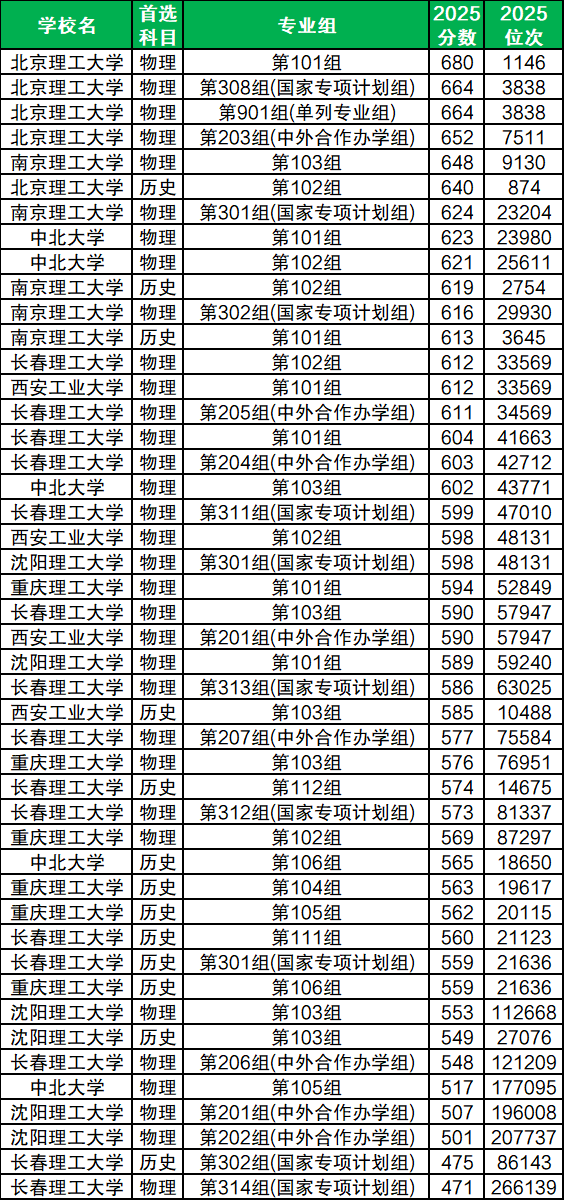 数据显示,2025年在河南历史类招生的院校专业组有13所,其中分数最高的是北京理工大学102组,最低录取分数线为640分,对应位次是874名;分数最低的是长春理工大学第302组(国家专项计划组),最低录取分为475分,对应位次是86143名。