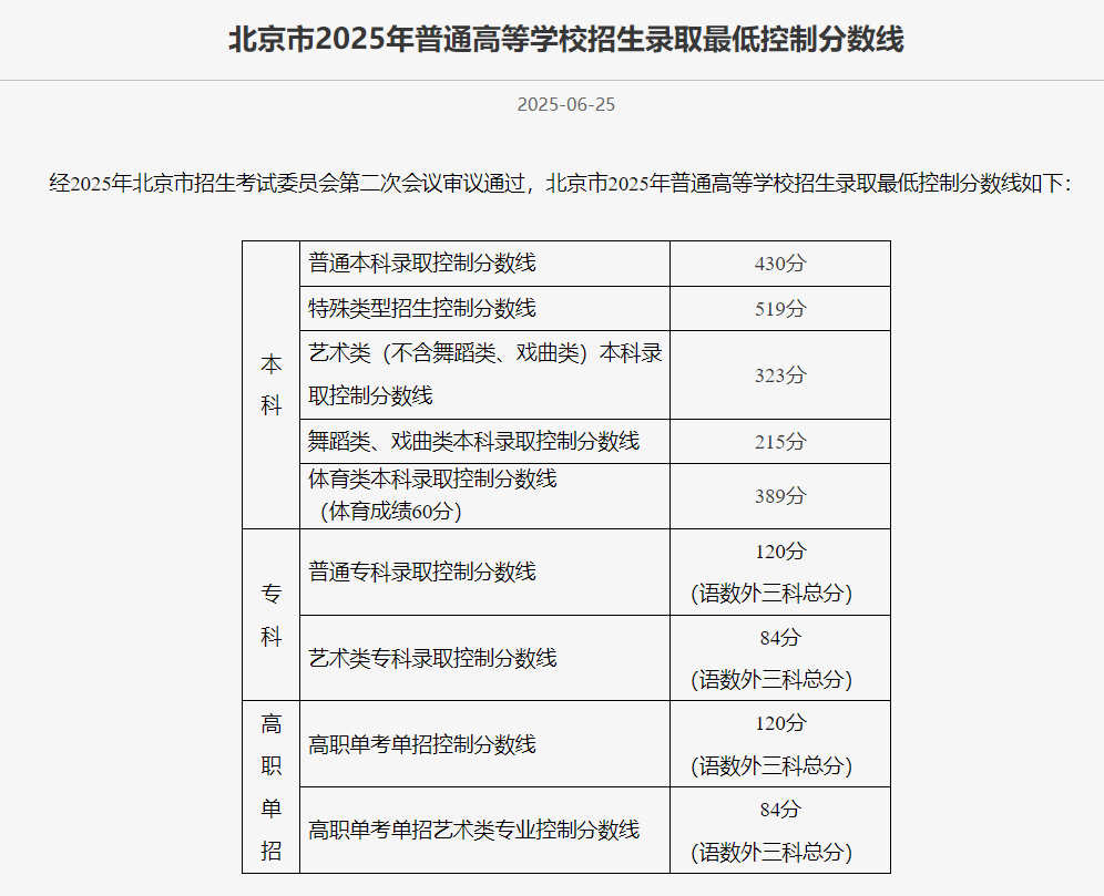 2025年北京高考分数线为:特控线为519分、本科为430分。 关于2025北京高考更多分数线及一分一段表详情,本文都进行了整理,供查阅。