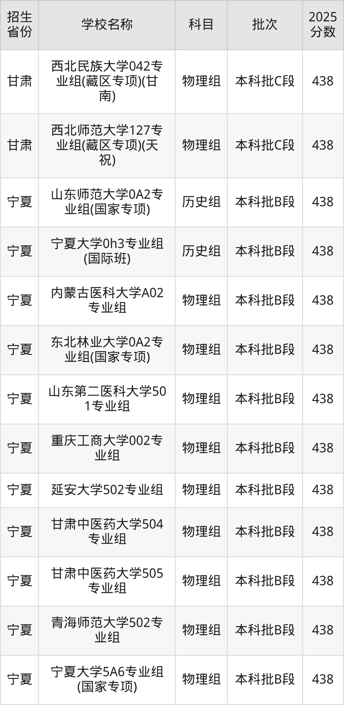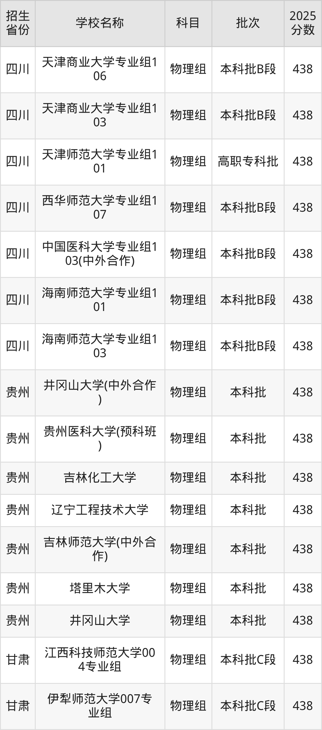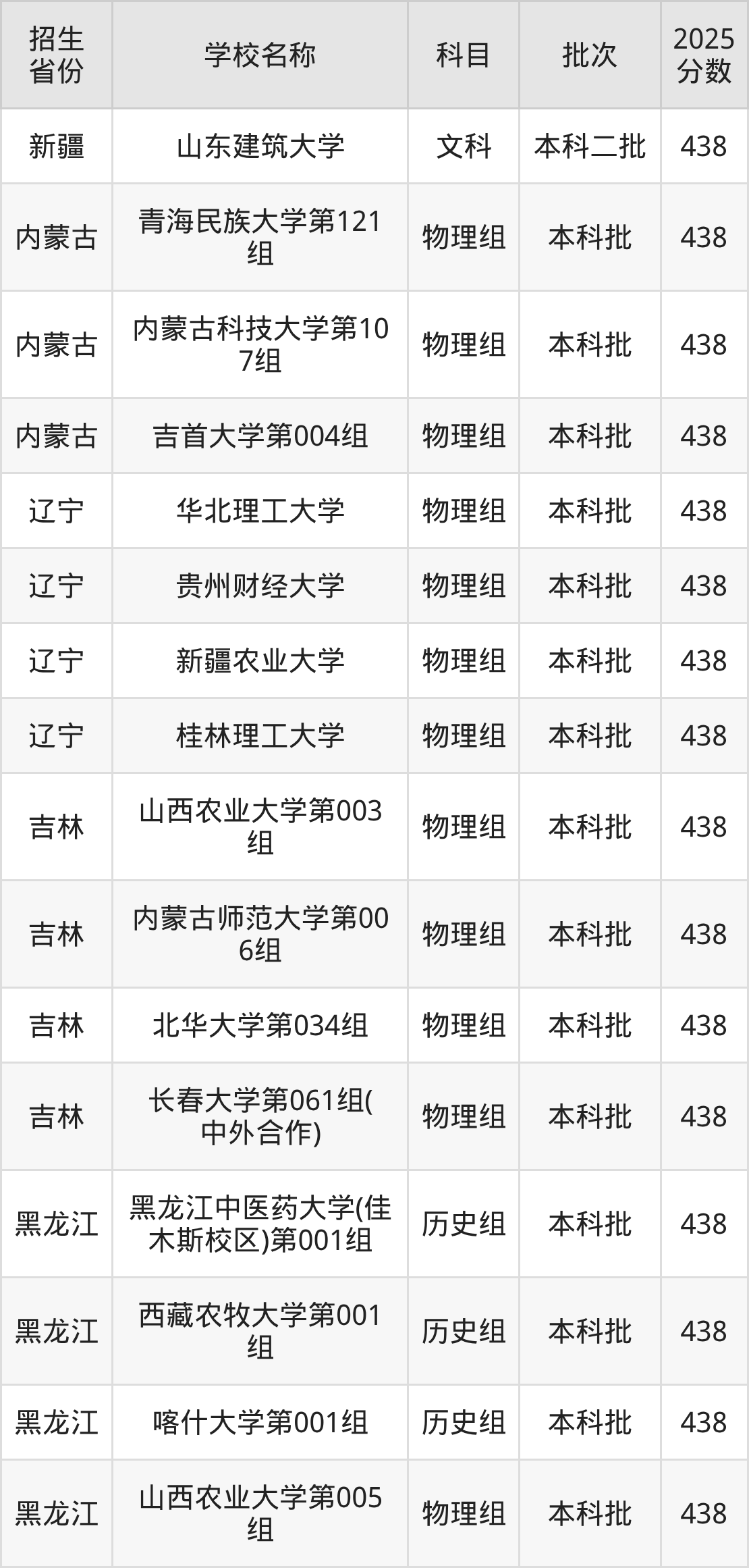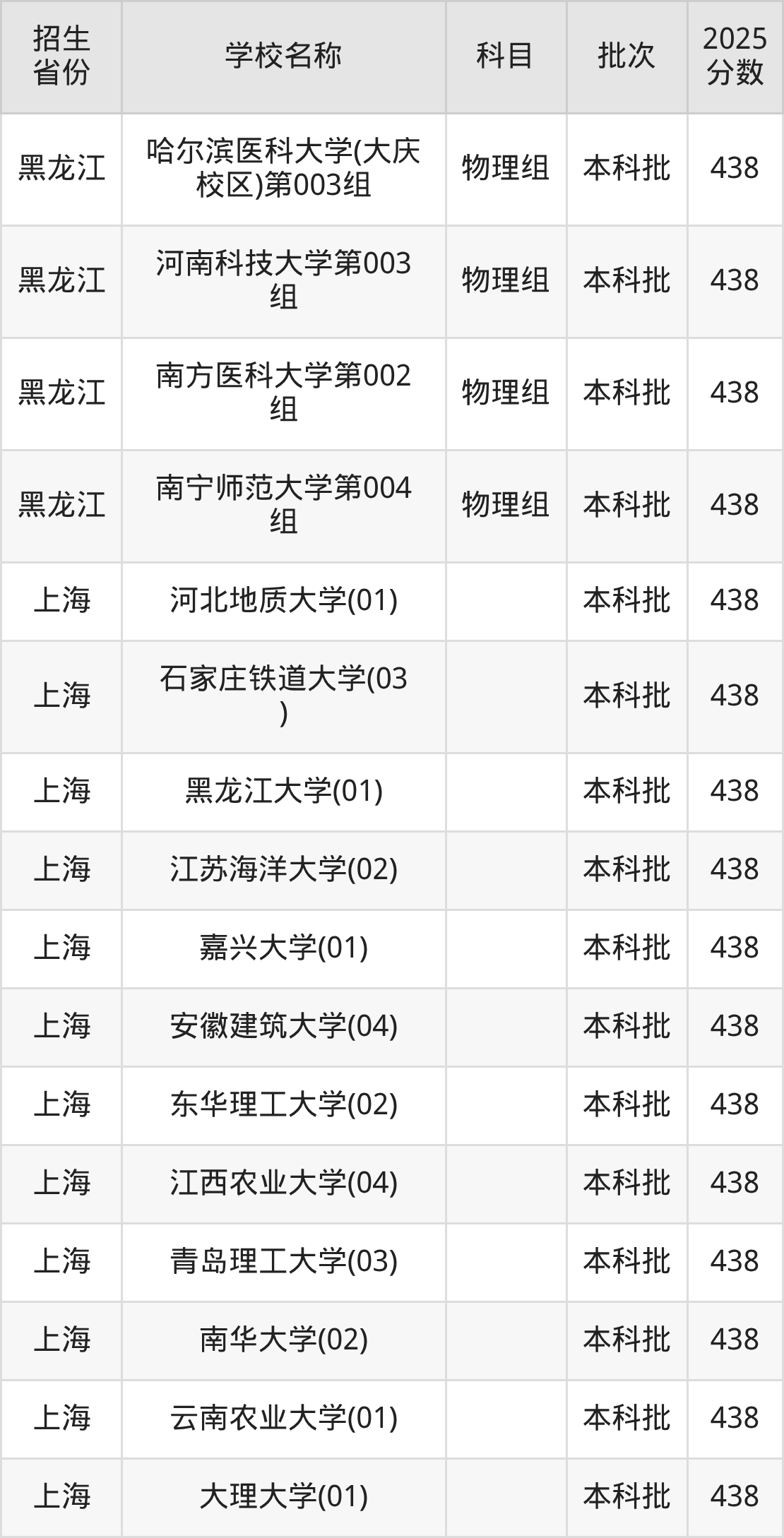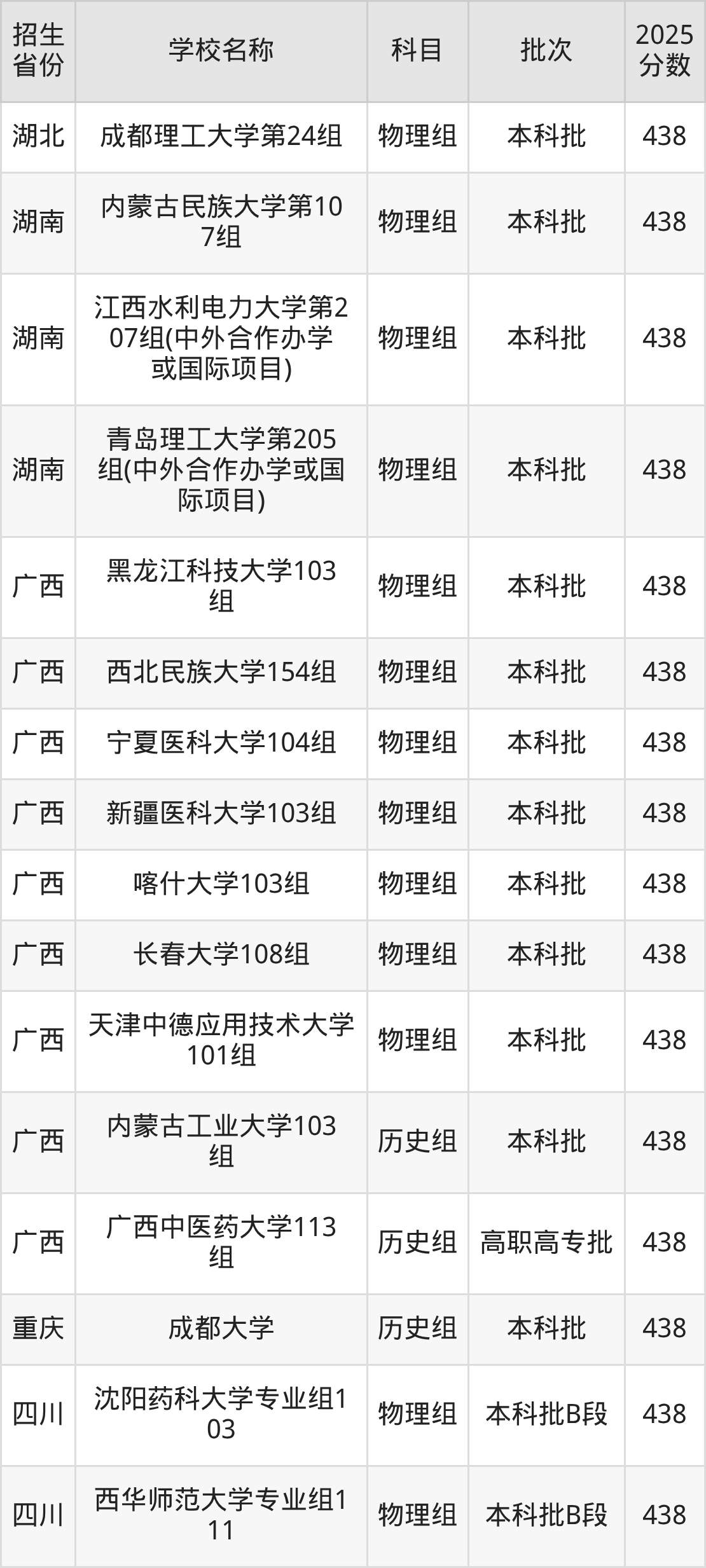 筛选全国各省2025年录取分数线为438分的一本大学如下:
