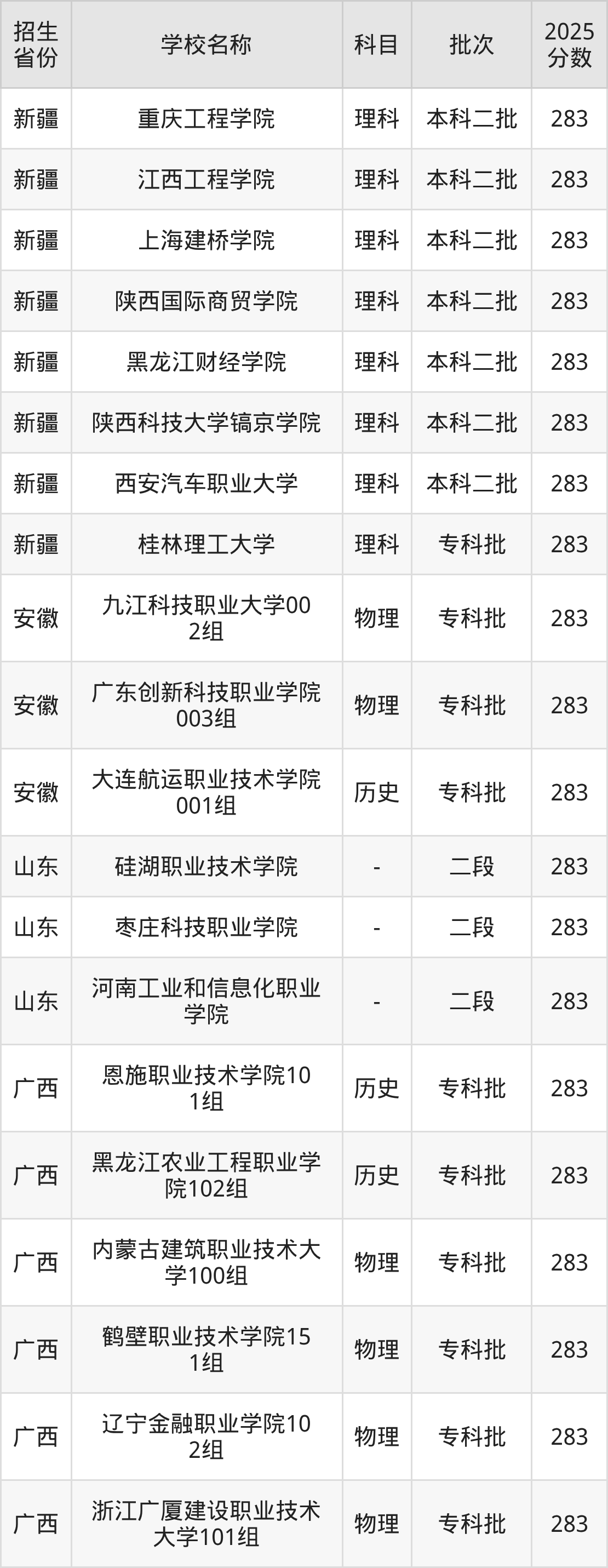 筛选全国各省2025年录取分数线为283分的理科大学如下: