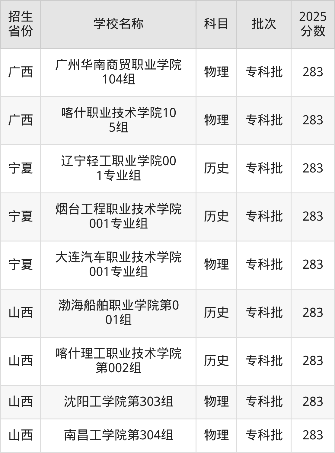 山西省历史组分数线是283分的理科大学有:渤海船舶职业学院、喀什理工职业技术学院。