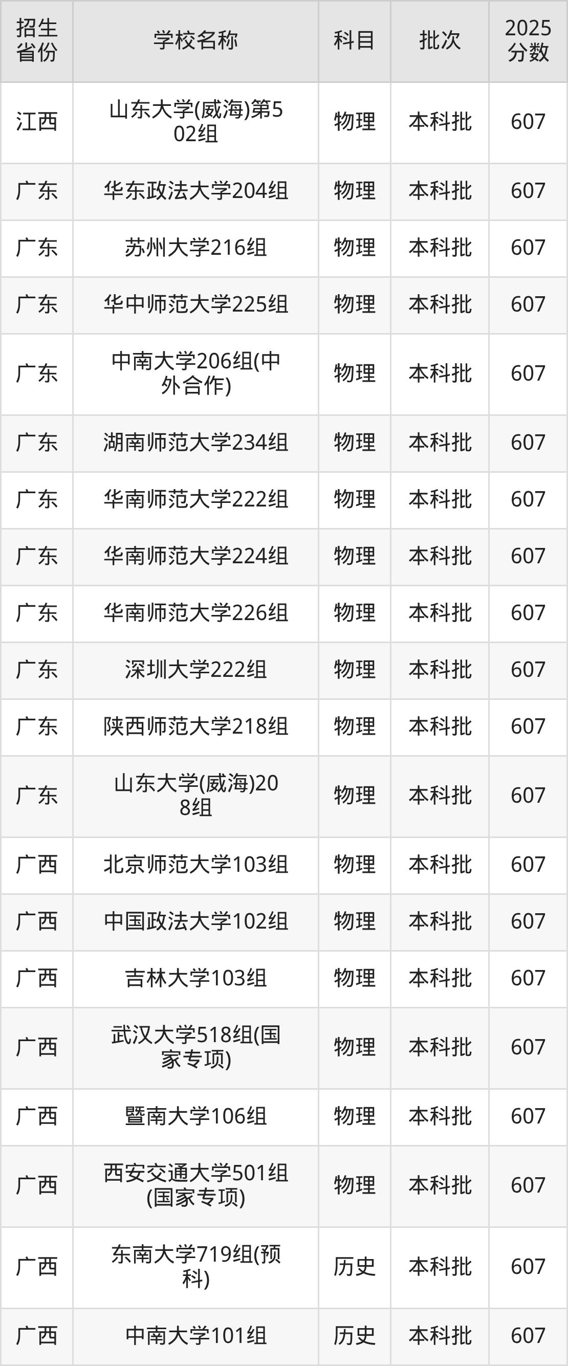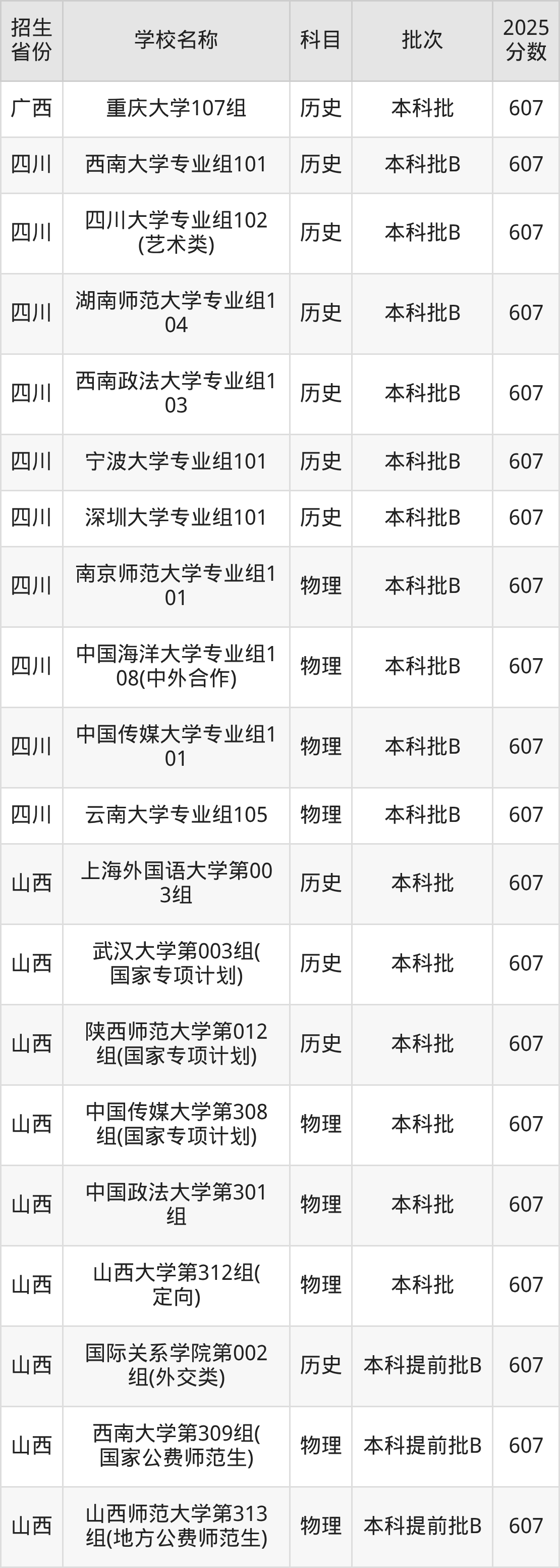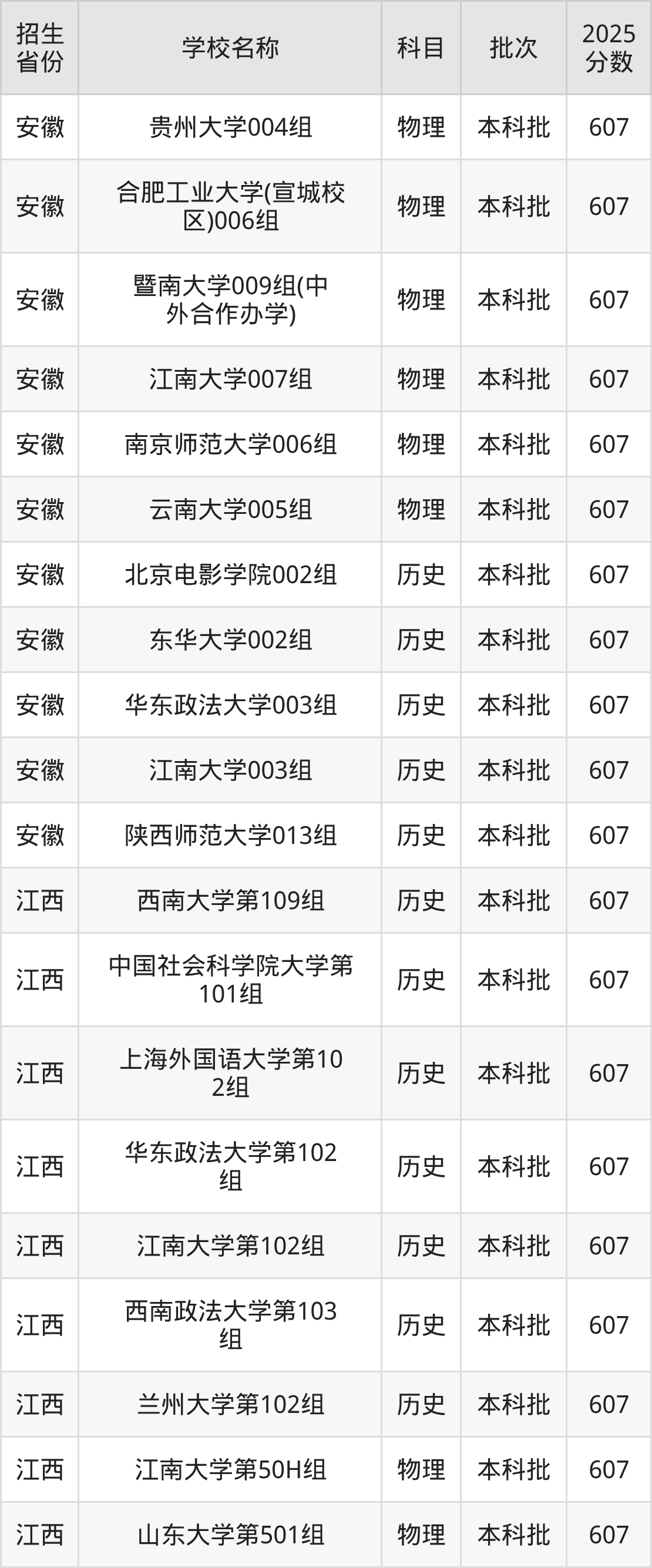筛选全国各省2025年录取分数线为607分的文科大学如下: