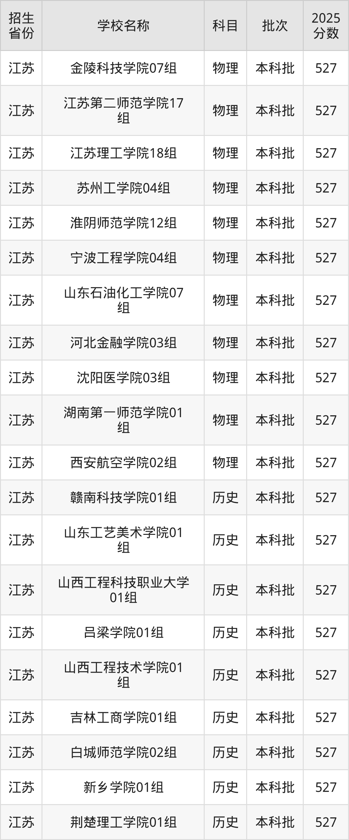 江苏省历史组分数线是527分的二本公办大学有:赣南科技学院、山东工艺美术学院、山西工程科技职业大学、吕梁学院、山西工程技术学院、吉林工商学院、白城师范学院、新乡学院、荆楚理工学院、湖南工学院。