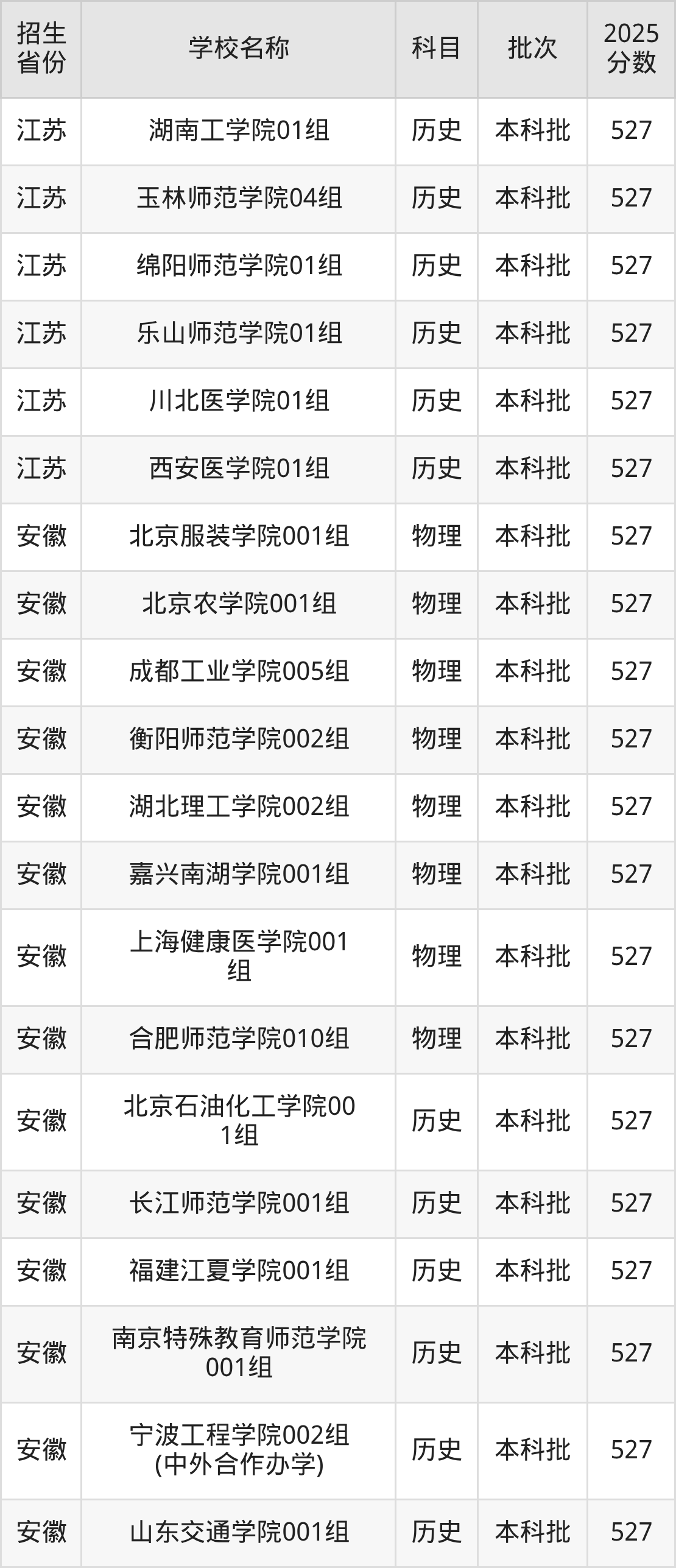 安徽省历史组分数线是527分的二本公办大学有:北京石油化工学院、长江师范学院、福建江夏学院、南京特殊教育师范学院、宁波工程学院、山东交通学院、潍坊学院、合肥师范学院、淮南师范学院。