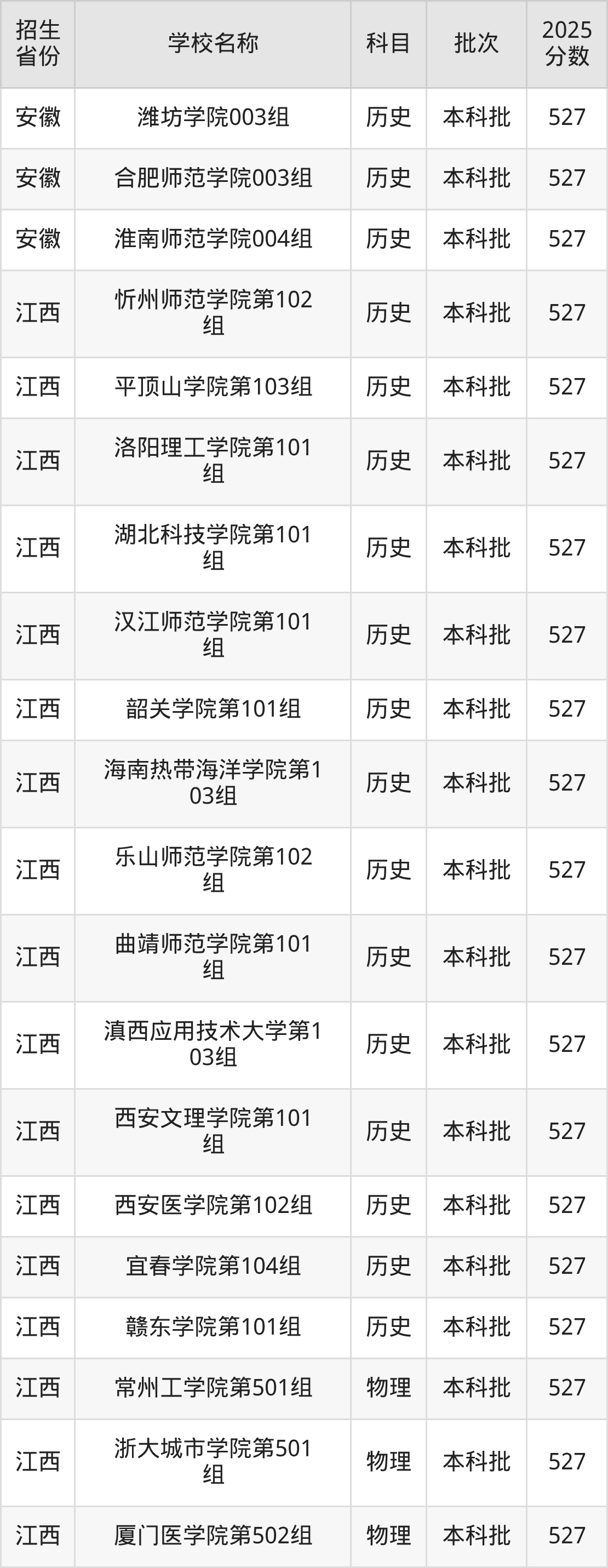 江西省历史组分数线是527分的二本公办大学有:忻州师范学院、平顶山学院、洛阳理工学院、湖北科技学院、汉江师范学院、韶关学院、海南热带海洋学院、乐山师范学院、曲靖师范学院、滇西应用技术大学。