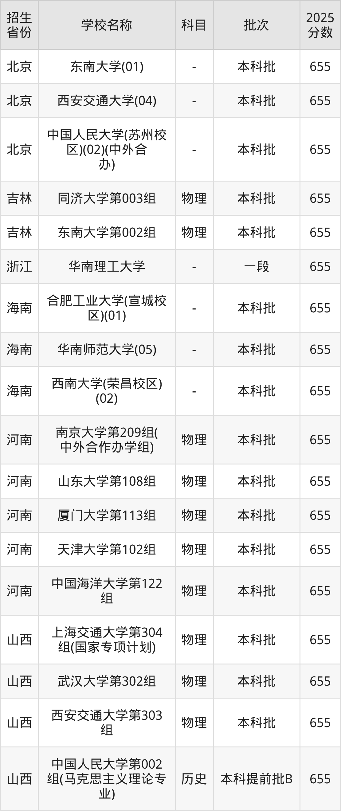 筛选全国各省2025年录取分数线为655分的文科大学如下: