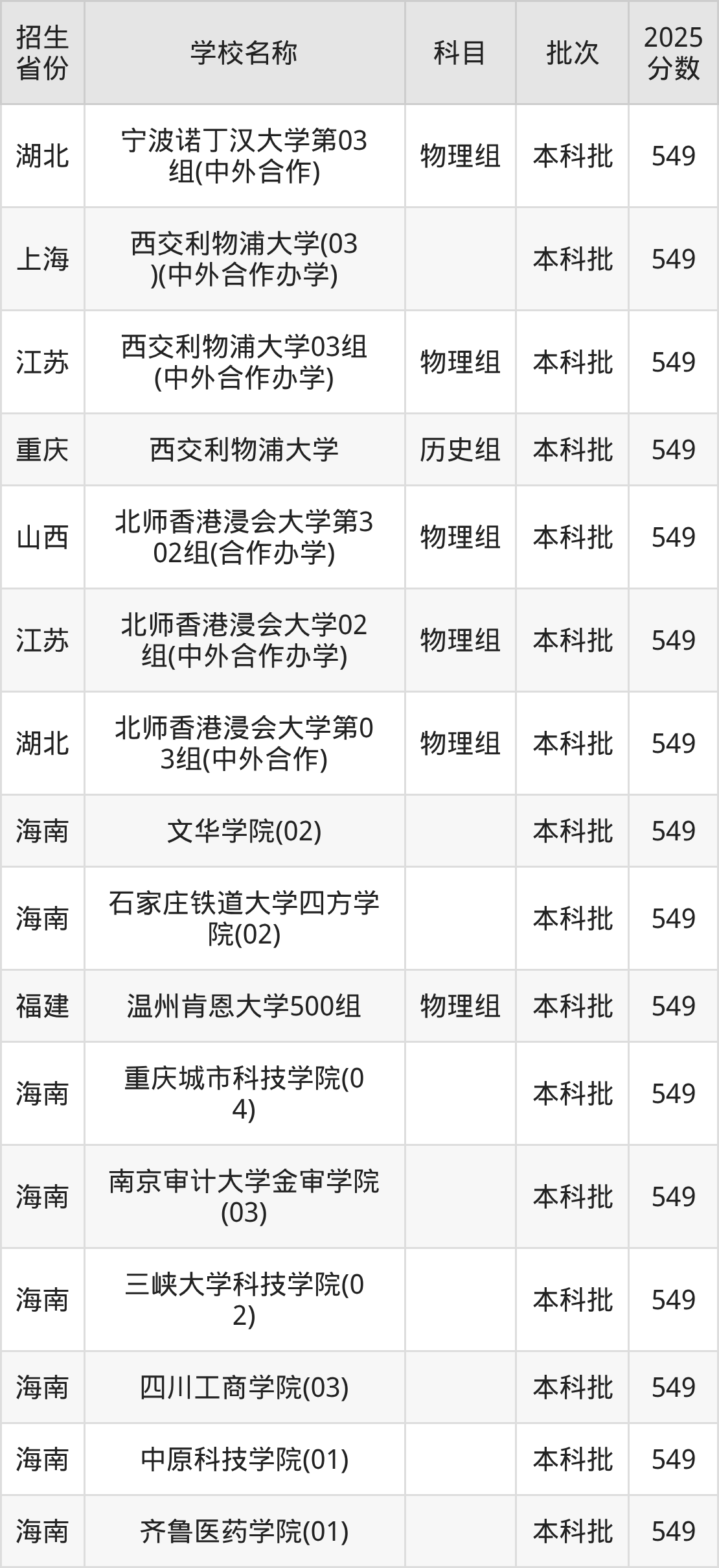 549分可以上的大学有宁波诺丁汉大学、西交利物浦大学、北师香港浸会大学、文华学院等二本民办大学。本文整理了海南、湖北等全国549分左右的二本民办大学名单,请2026年高考生参考。