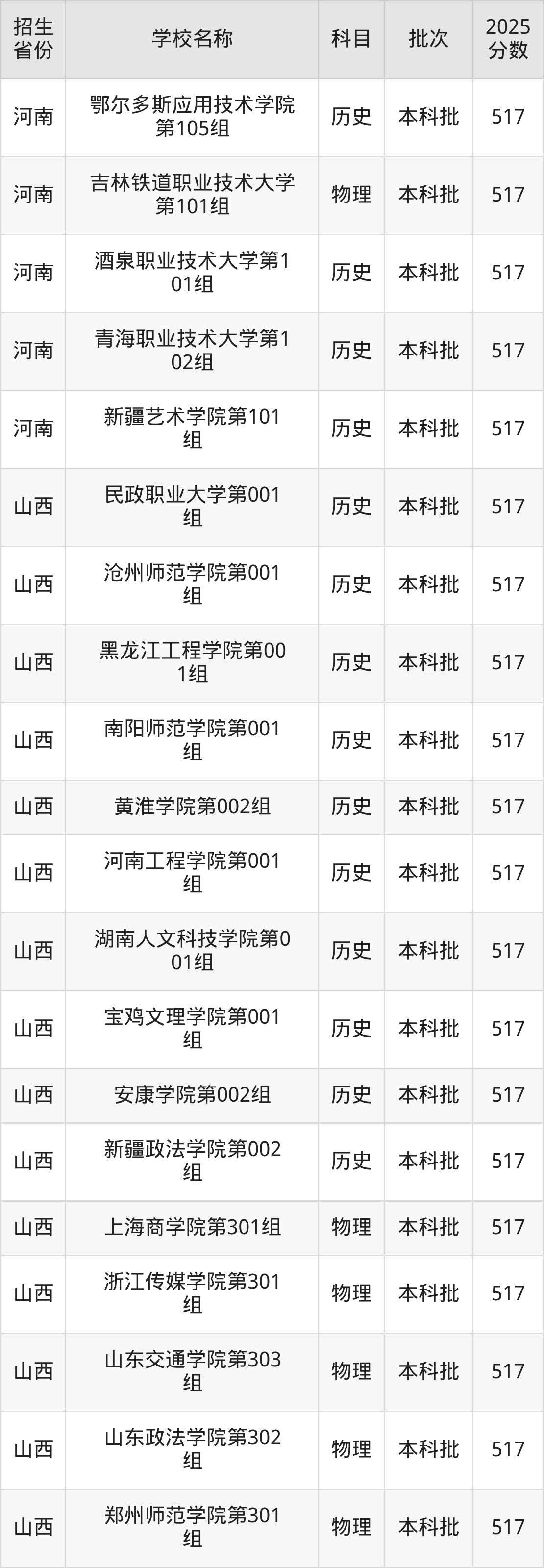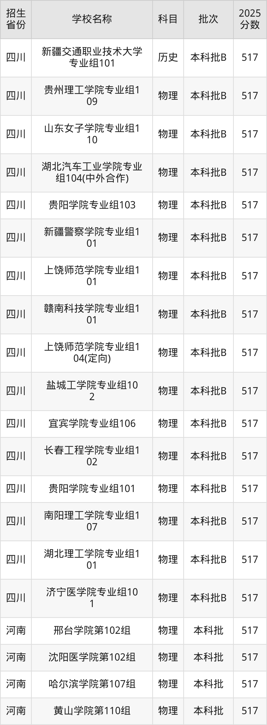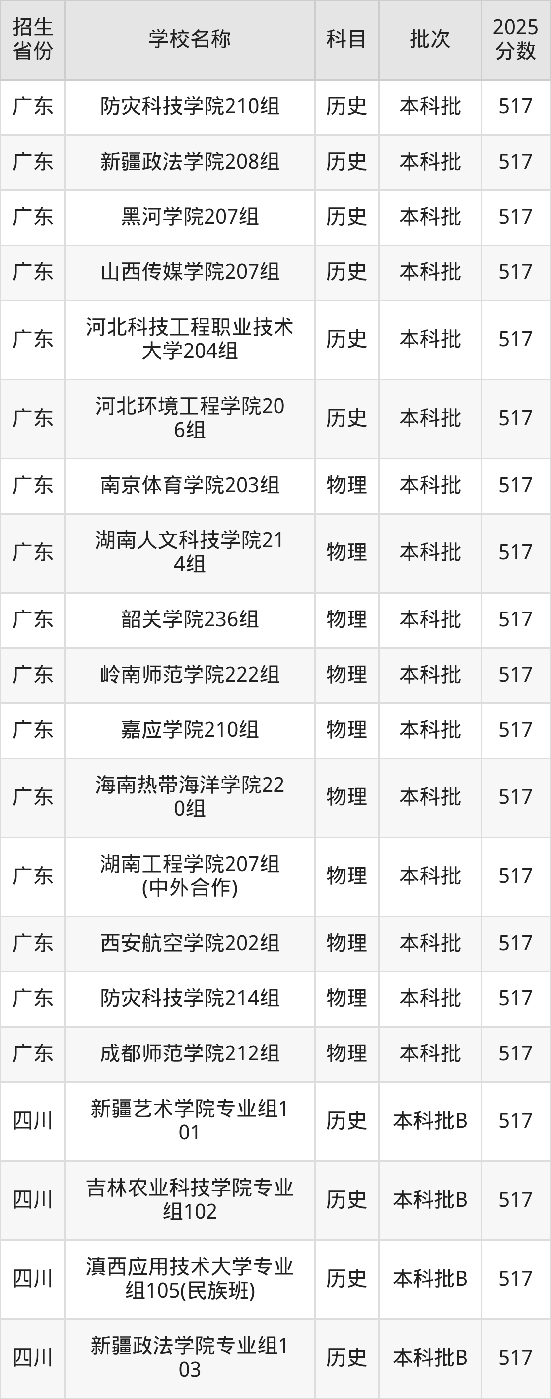 二、各省517分的二本公办大学名单