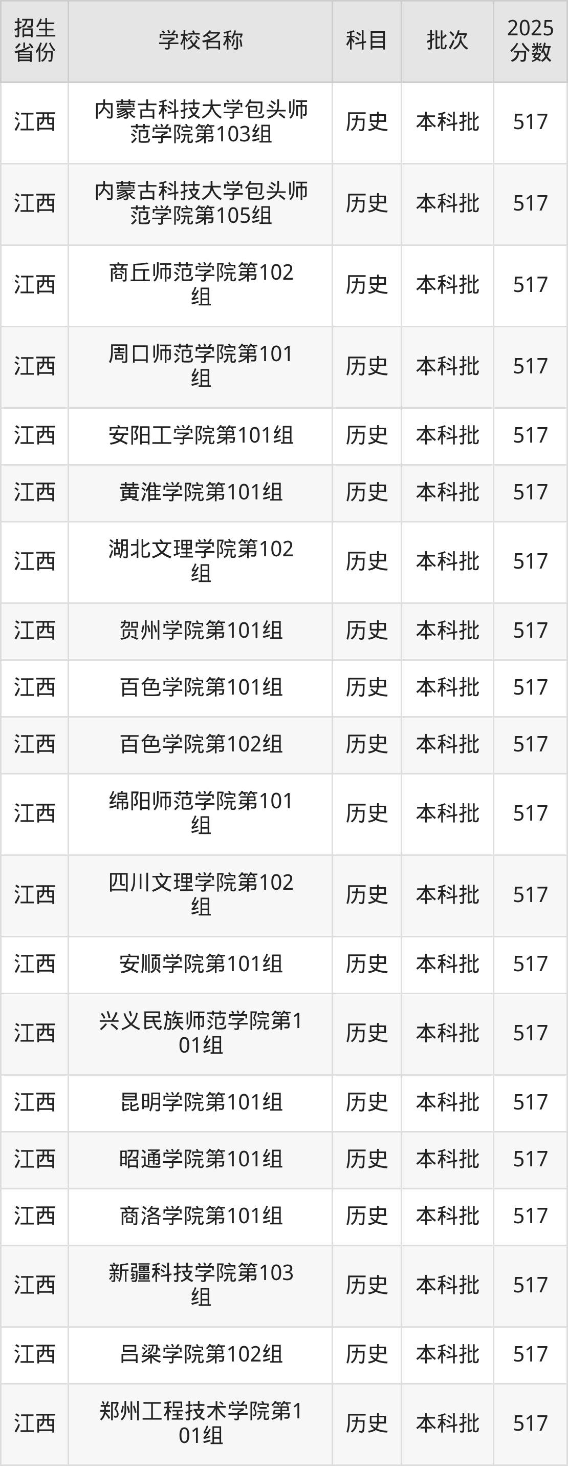 江西省历史组分数线是517分的二本公办大学有:衡水学院、太原学院、内蒙古科技大学包头师范学院、商丘师范学院、周口师范学院、安阳工学院、黄淮学院、湖北文理学院、贺州学院、百色学院。