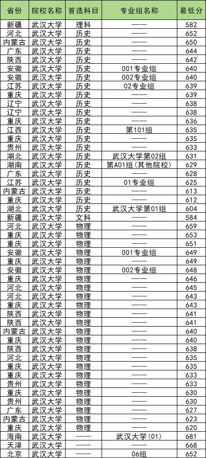 下面分专业为大家介绍2025武汉大学录取分数线情况: