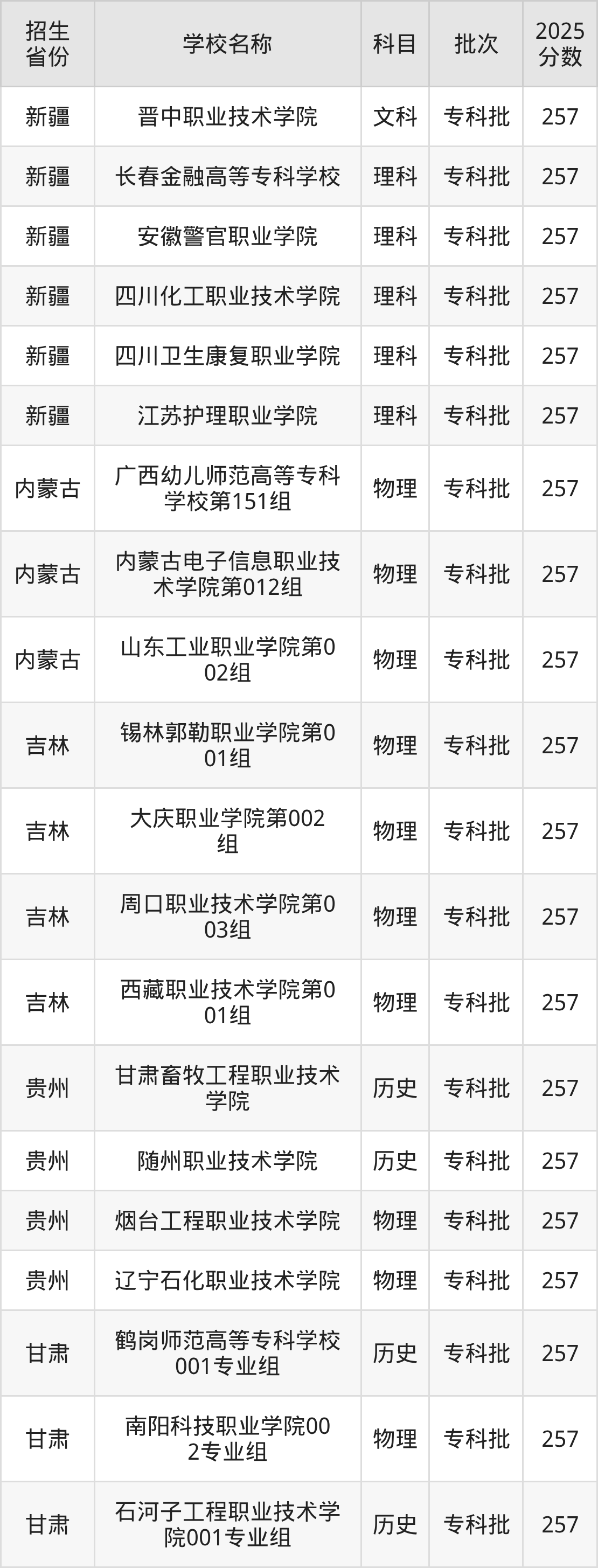 二、各省257分的公办专科大学名单