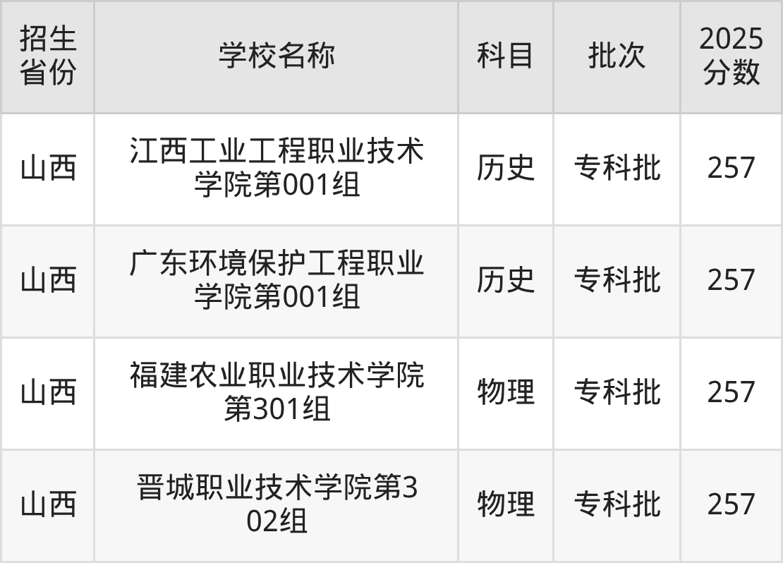山西省历史组分数线是257分的公办专科大学有:江西工业工程职业技术学院、广东环境保护工程职业学院。