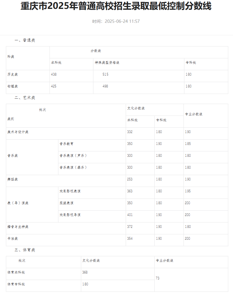 2025年重庆高考各批次录取分数线已公布,普通类历史和物理分数线具体详情如下: