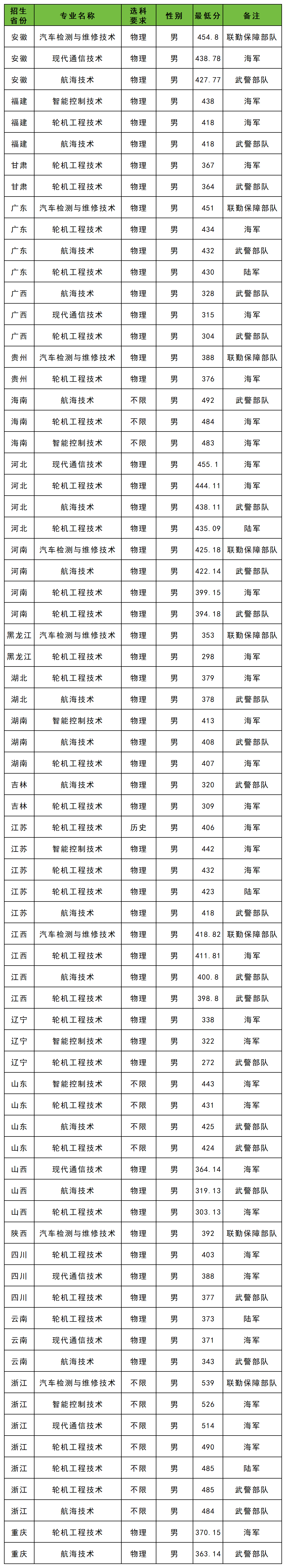 下面是浙江交通职业技术学院2025年在全国各省定向士官招生分数线一览表,供参考: