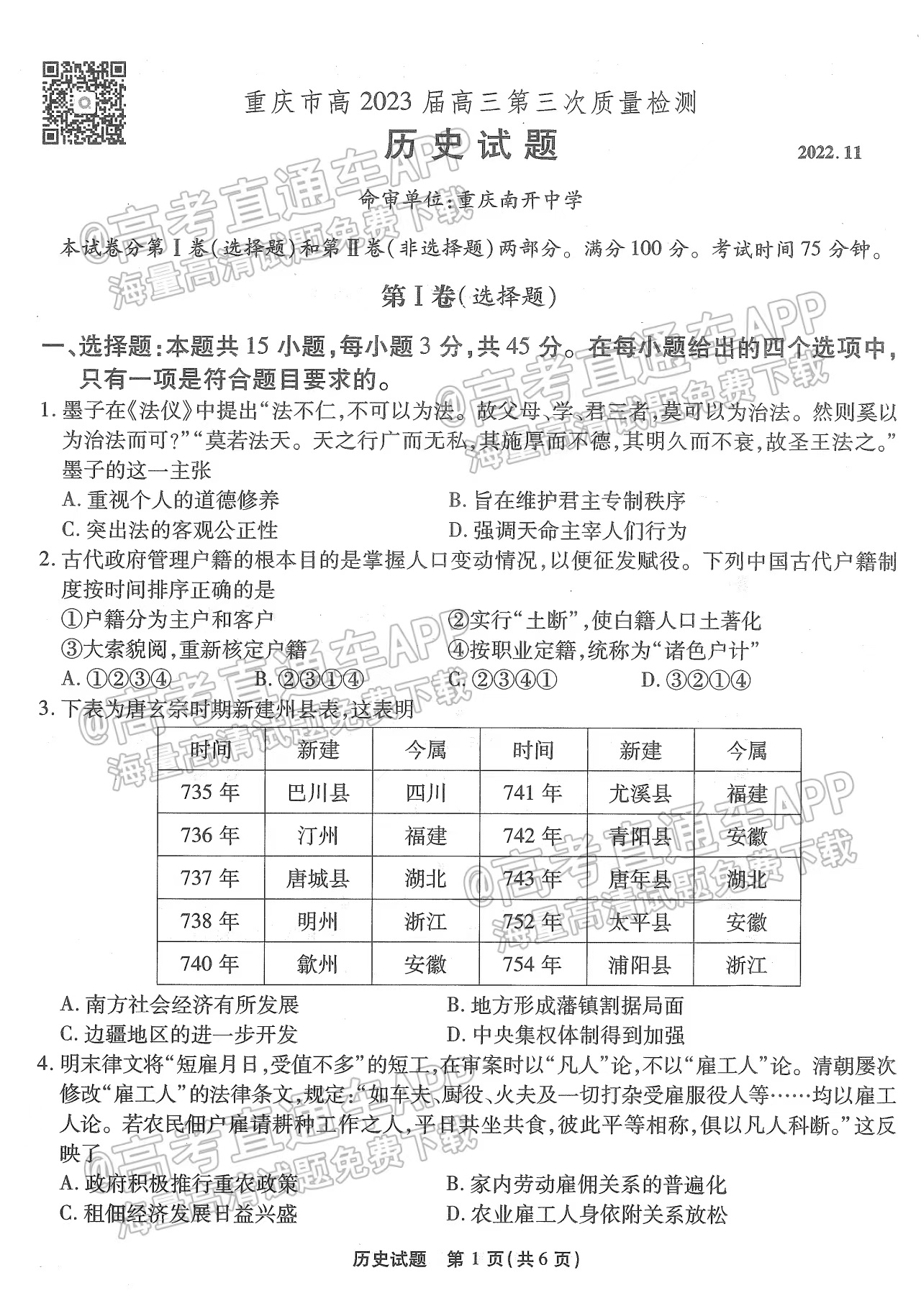 目前2023重庆高三联考历史试卷已更新,具体试卷情况如下,如果大家想要了解更多试卷内容,可以进入高考100网进行查看,本试卷共6页,仅供参考。