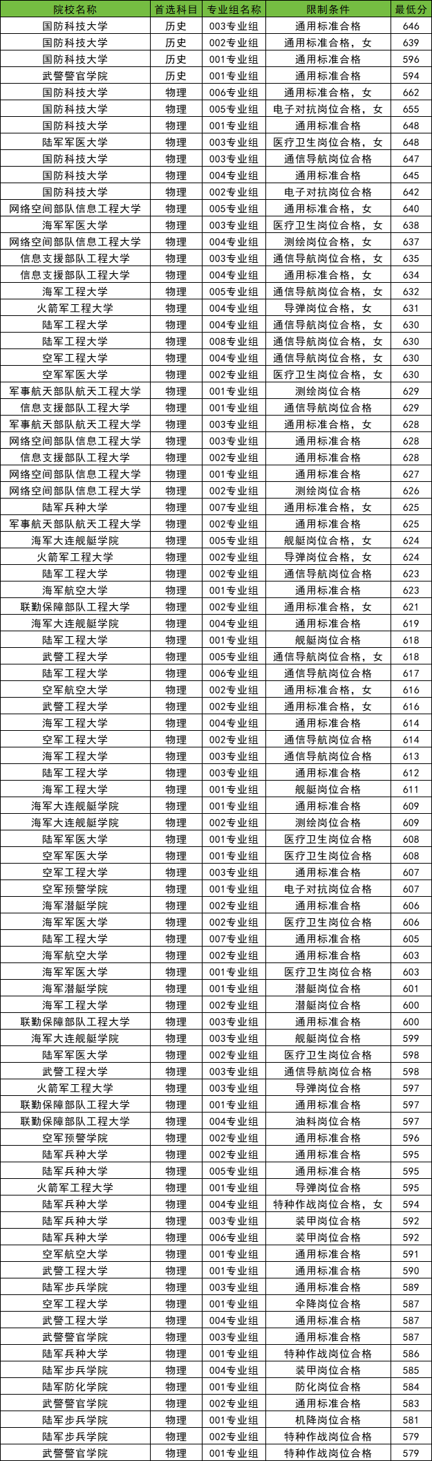 2025年安徽军校物理类录取分数线在579分-662分之间,录取分数最高的是国防科技大学006专业组(通用标准合格,女),2025年最低投档线662分;录取分数线最低的是武警警官学院001专业组(特种作战岗位合格),2025年投档最低分为579分。