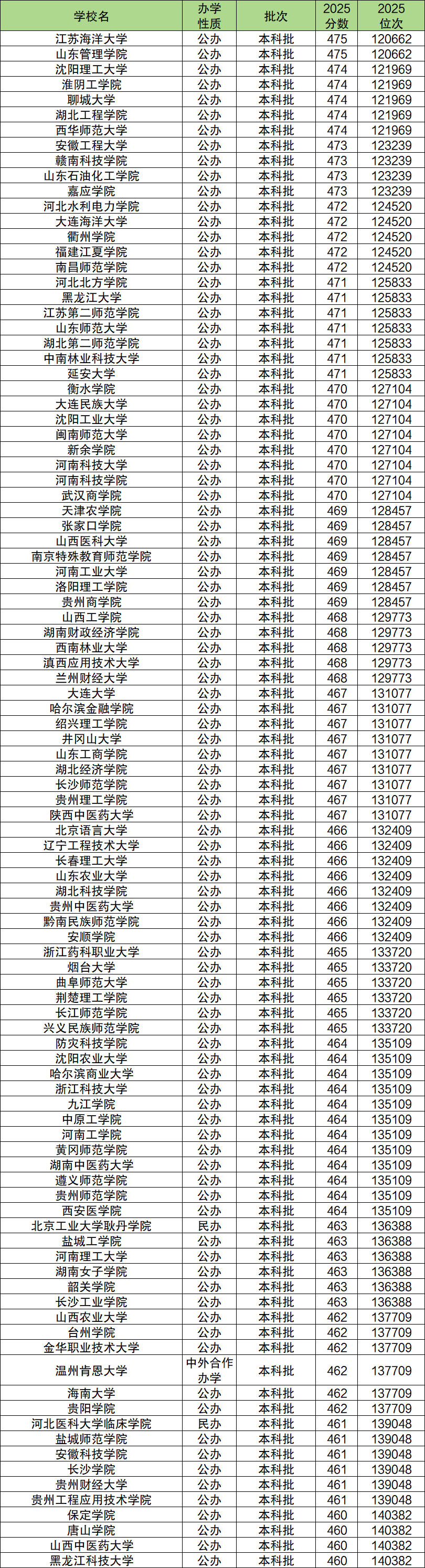本科线上录取分数线最高的是江苏海洋大学、山东管理学院,2025年最低分是475分,位次为120662名。最低分超472分的大学名单还包括西华师范大学(474分)、赣南科技学院(473分)、山东石油化工学院(473分)、嘉应学院(473分)等,这些大学录取位次在前12.4万名。