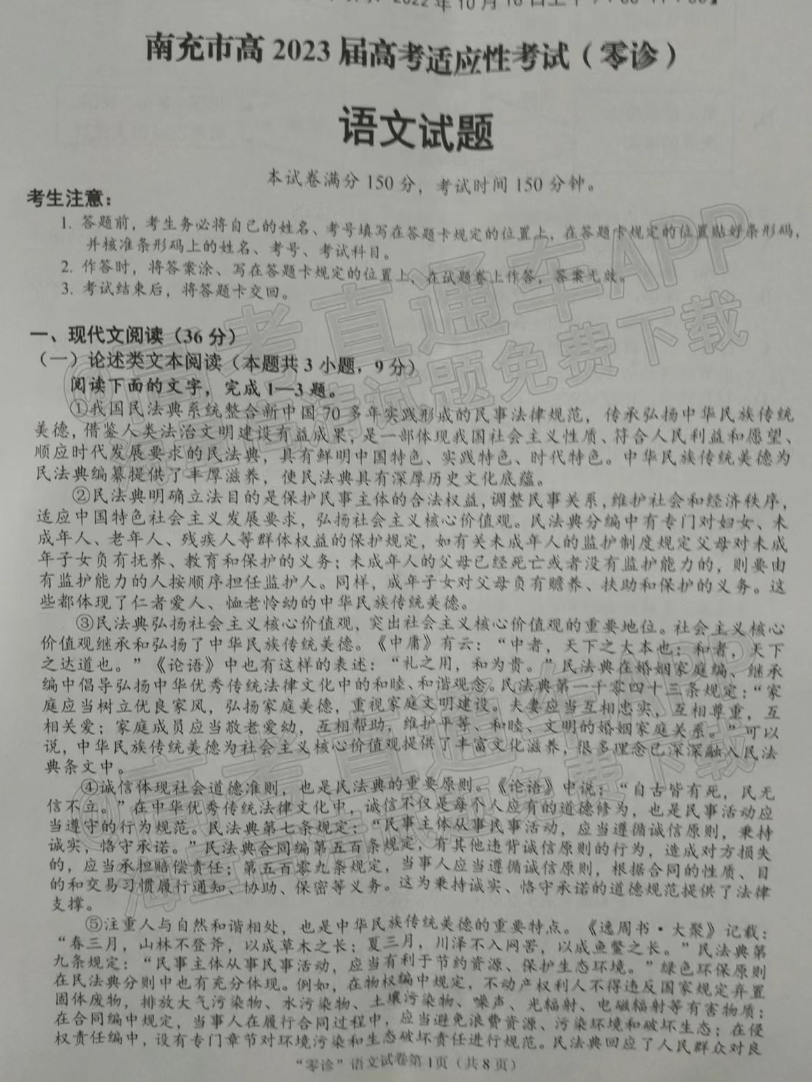 目前2023南充零诊语文试卷已更新,具体试卷情况如下,如果大家想要了解更多试卷内容,可以进入高考100网进行查看,本试卷共8页,仅供参考。