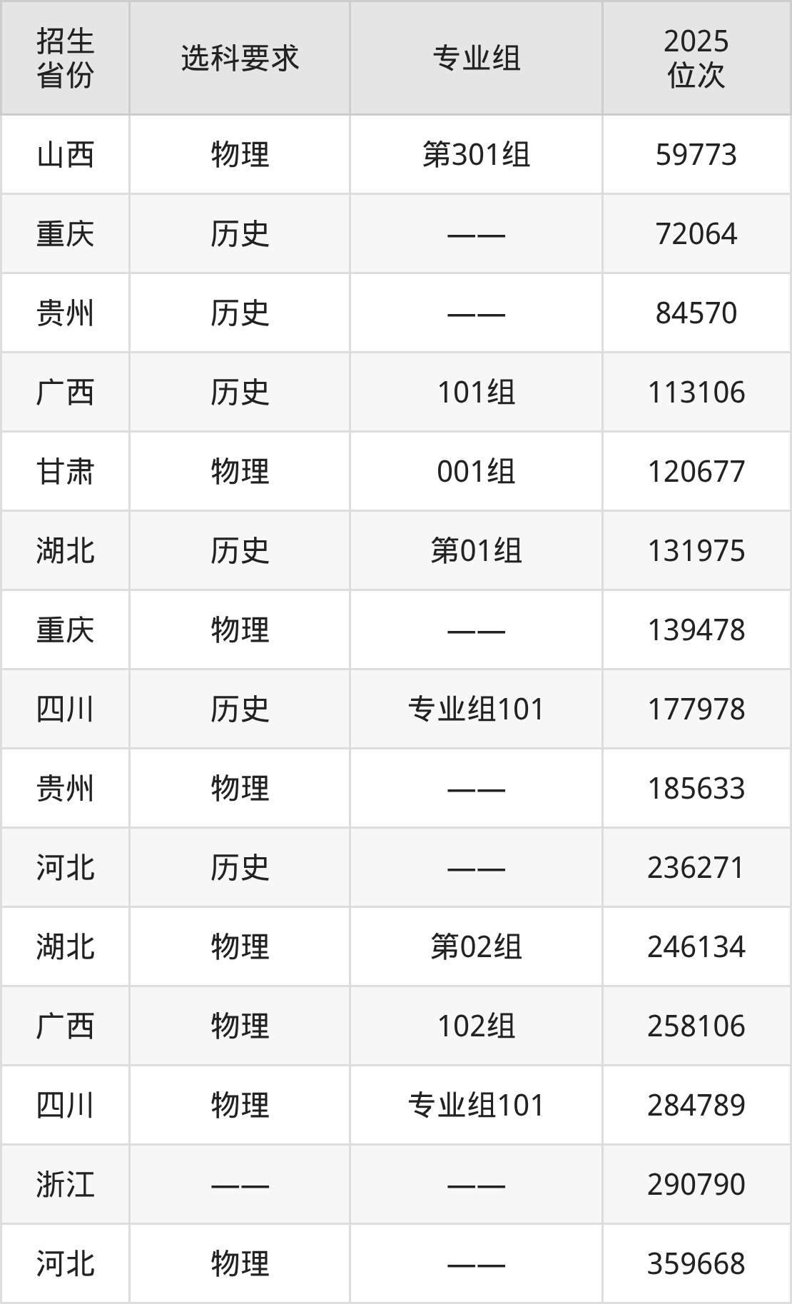 重庆应用技术职业学院2025年在全国各省的位次差异较大,最高位次是59773位(山西物理类)、最低位次是359668位(河北物理类)。各省具体位次请看下图:
