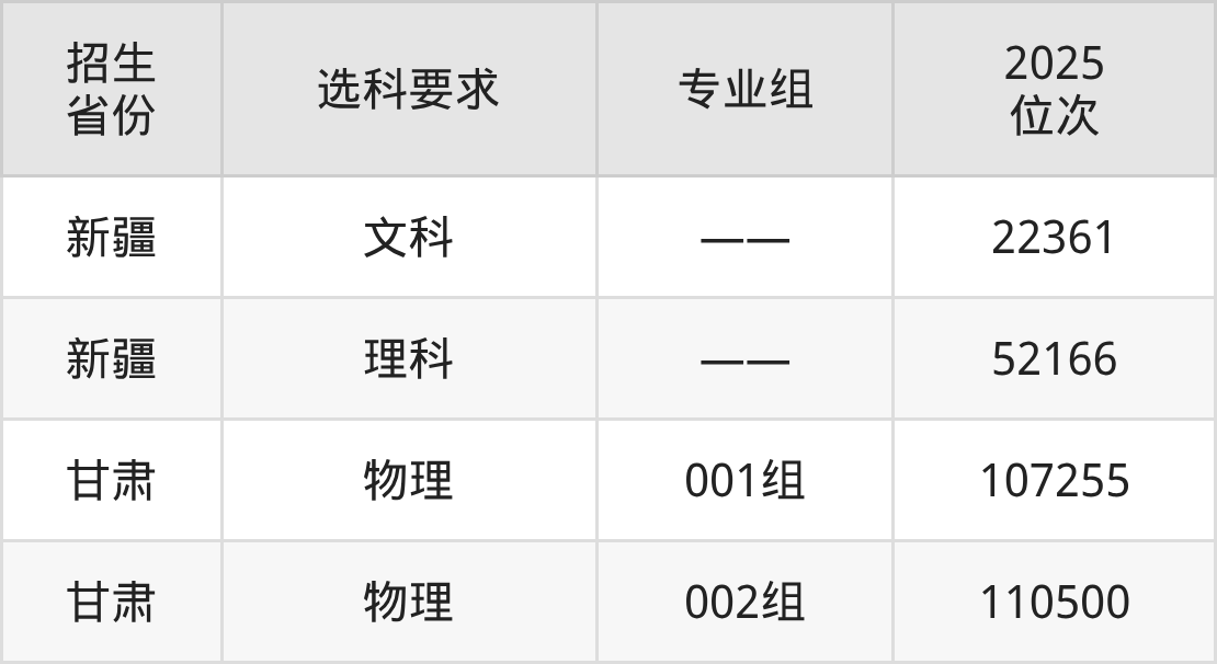 新疆工业职业技术学院2025年在全国各省的位次差异较大,最高位次是22361位(新疆文科)、最低位次是110500位(甘肃物理类)。各省具体位次请看下图: