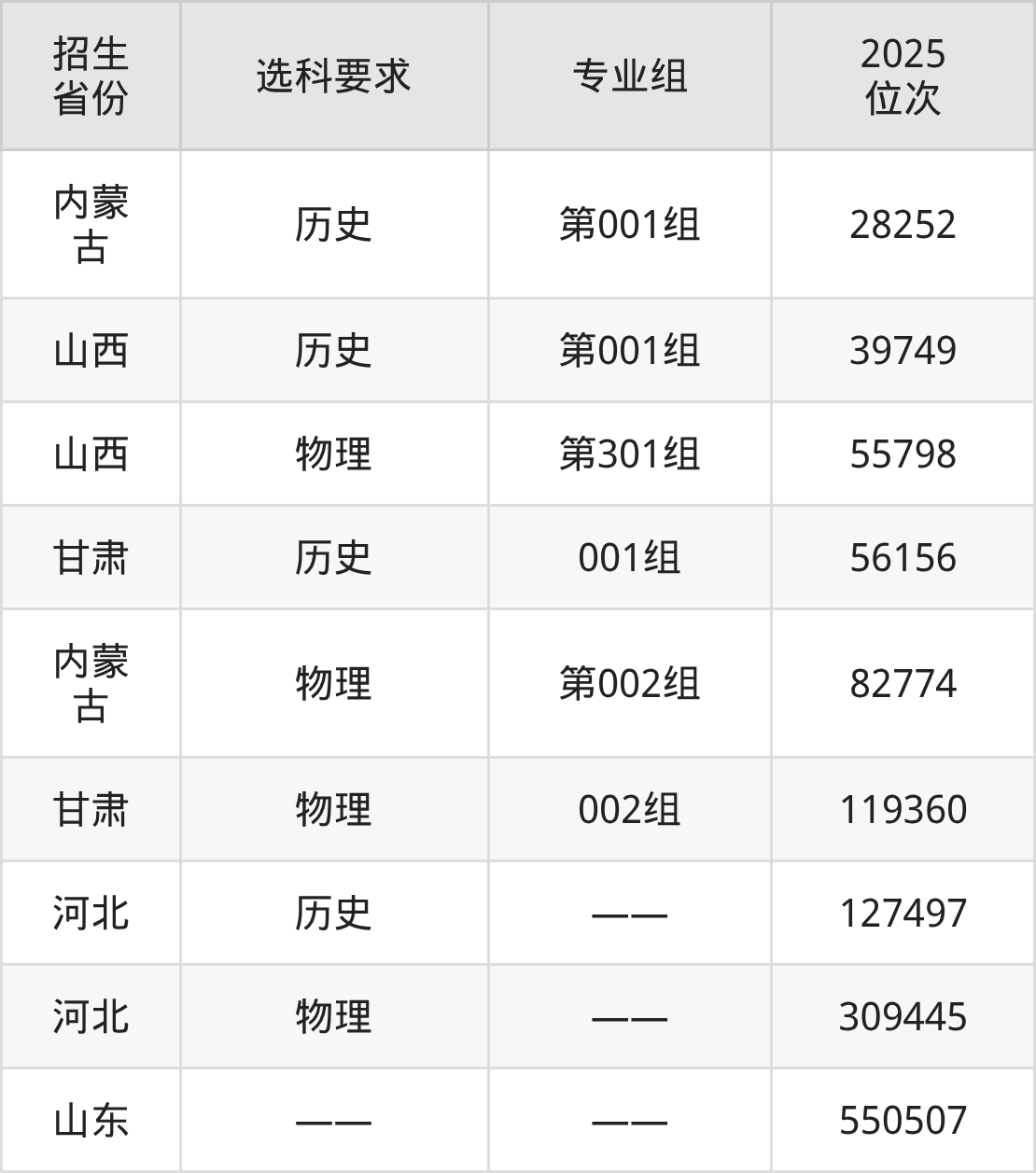 河北资源环境职业技术学院2025年在全国各省的位次差异较大,最高位次是28252位(内蒙古历史类)、最低位次是550507位(山东)。各省具体位次请看下图: