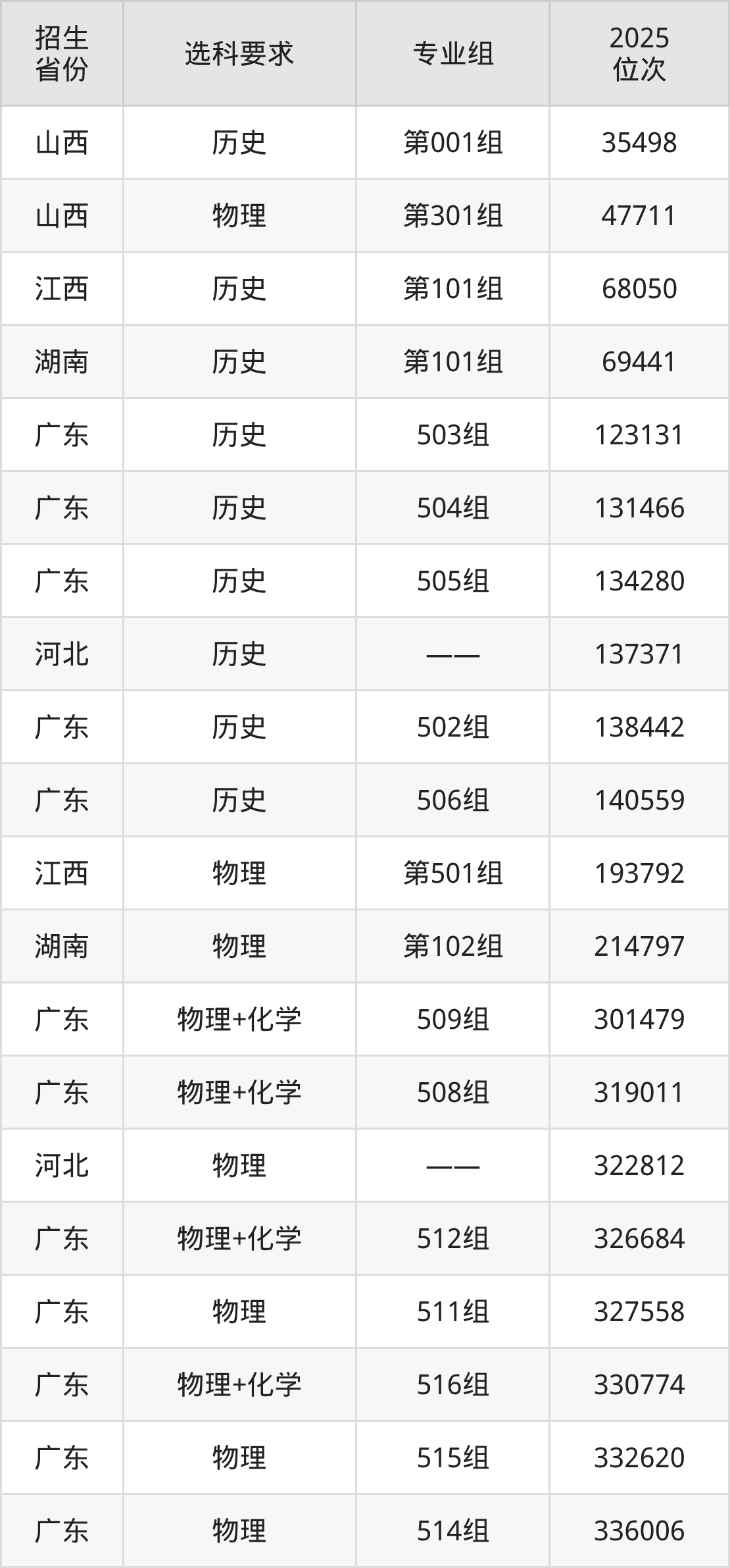 惠州工程职业学院2025年在全国各省的位次差异较大,最高位次是35498位(山西历史类)、最低位次是347155位(广东物理类)。各省具体位次请看下图: