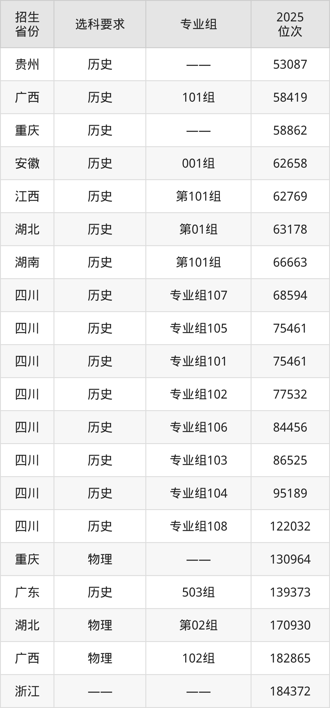 重庆幼儿师范高等专科学校2025年在全国各省的位次差异较大,最高位次是53087位(贵州历史类)、最低位次是307630位(广东物理类)。各省具体位次请看下图:
