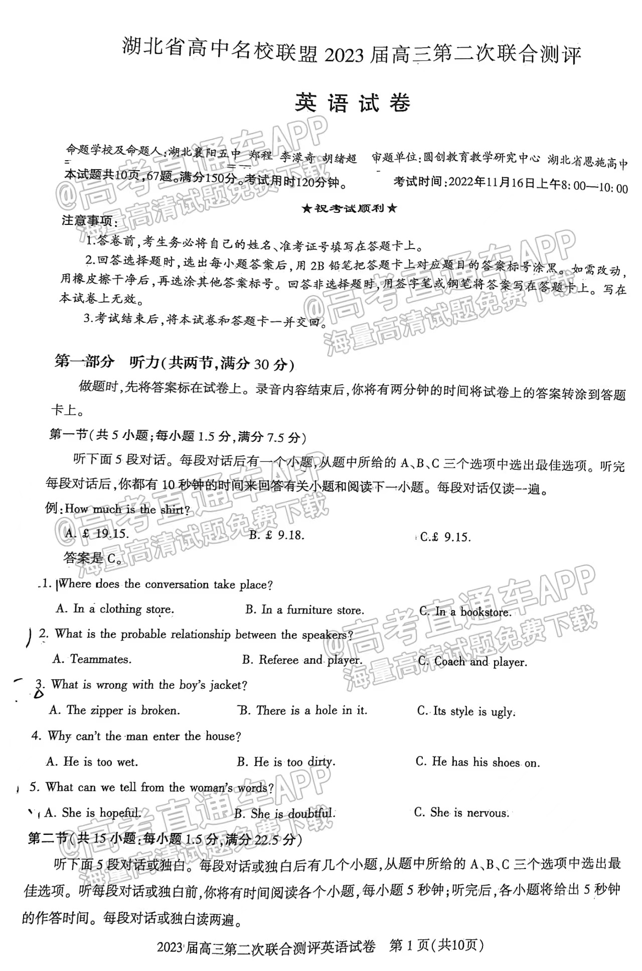 一.2023湖北圆创联盟高三11月联考英语试卷及答案详情汇总