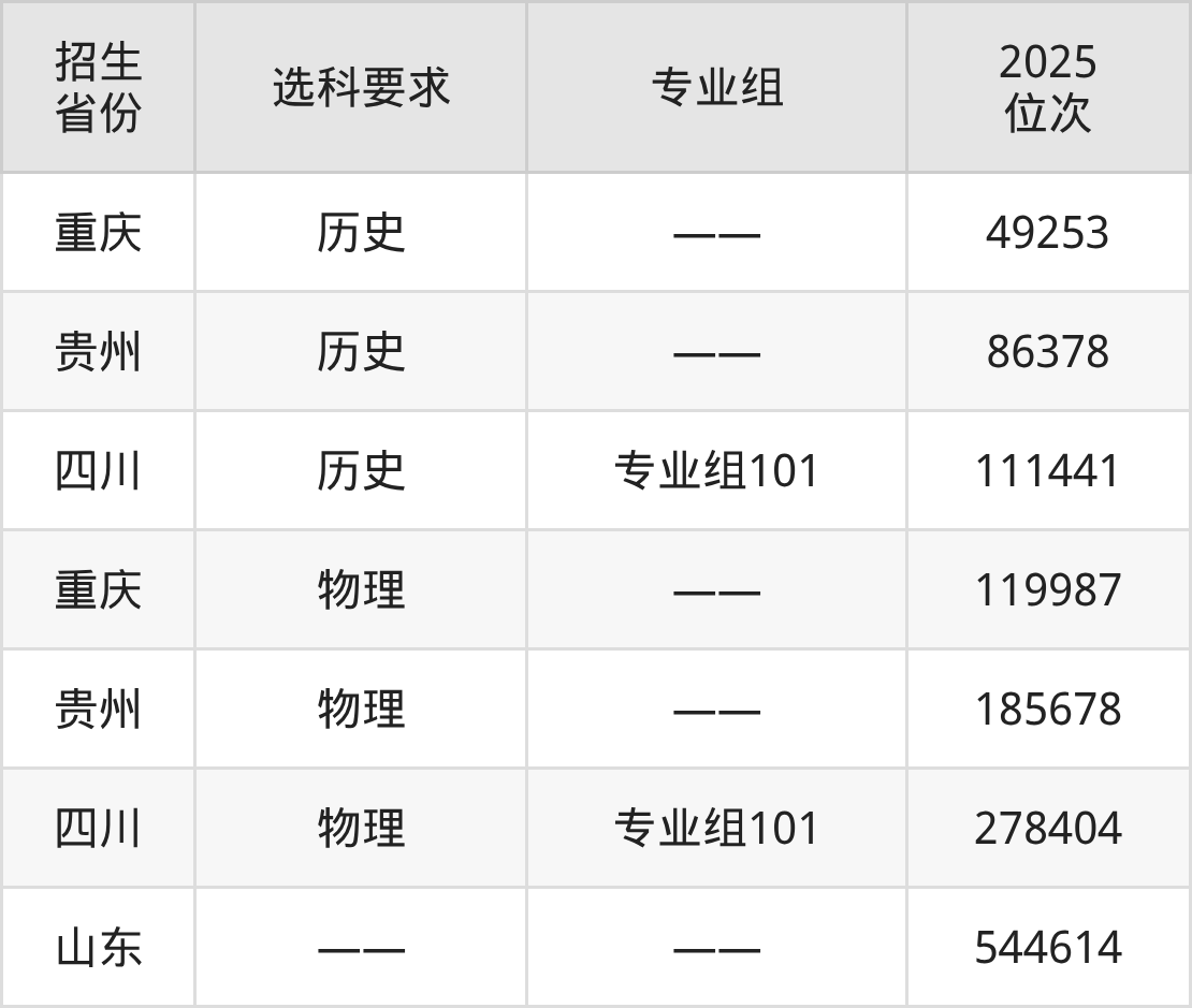 内江职业技术学院2025年在全国各省的位次差异较大,最高位次是49253位(重庆历史类)、最低位次是544614位(山东)。各省具体位次请看下图: