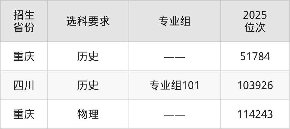 重庆文化艺术职业学院2025年在全国各省的位次差异较大,最高位次是51784位(重庆历史类)、最低位次是114243位(重庆物理类)。各省具体位次请看下图: