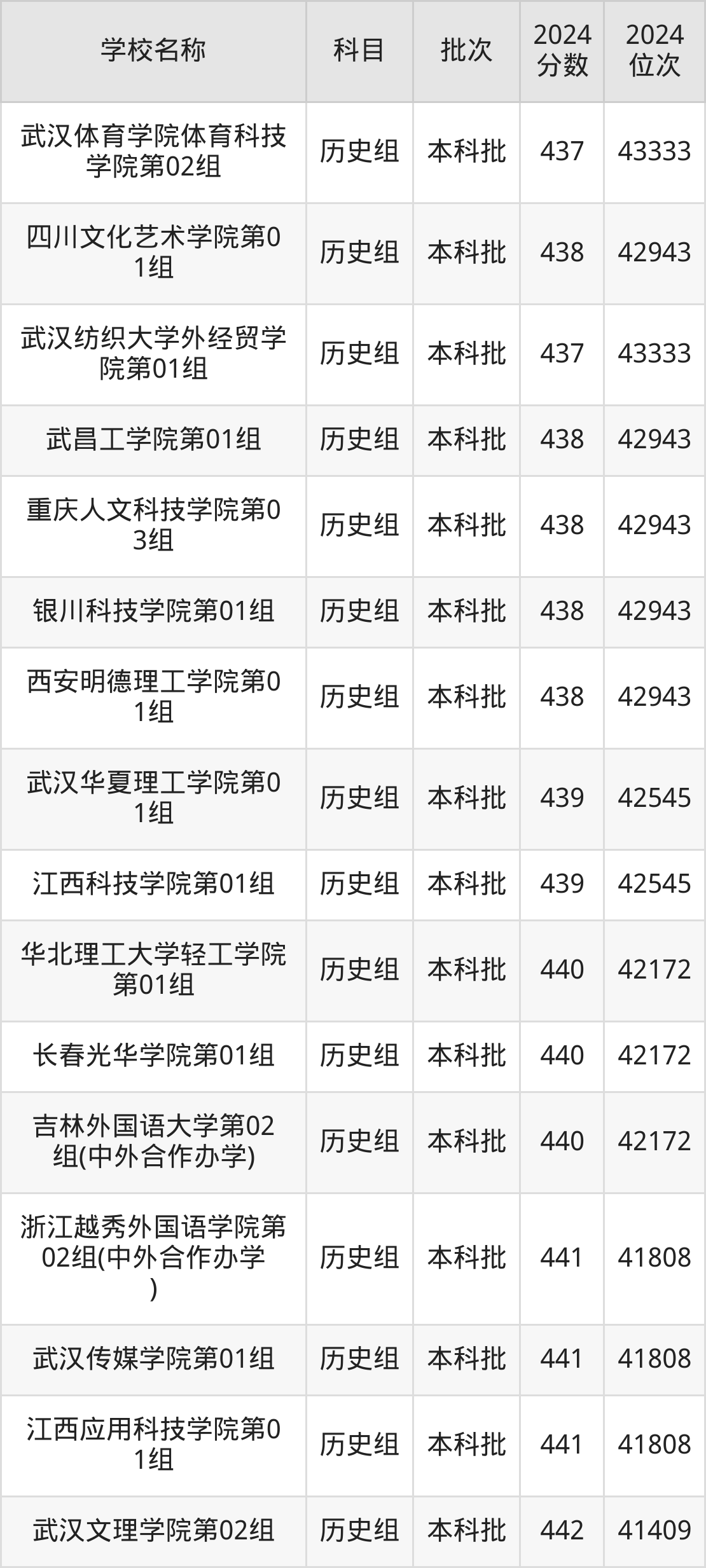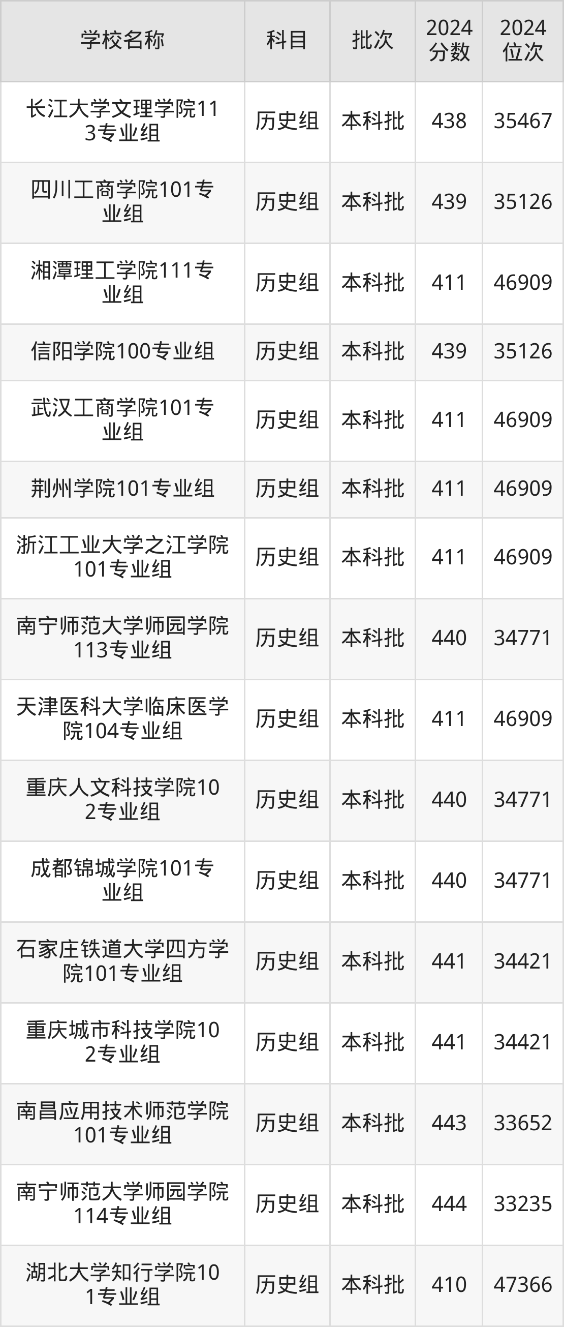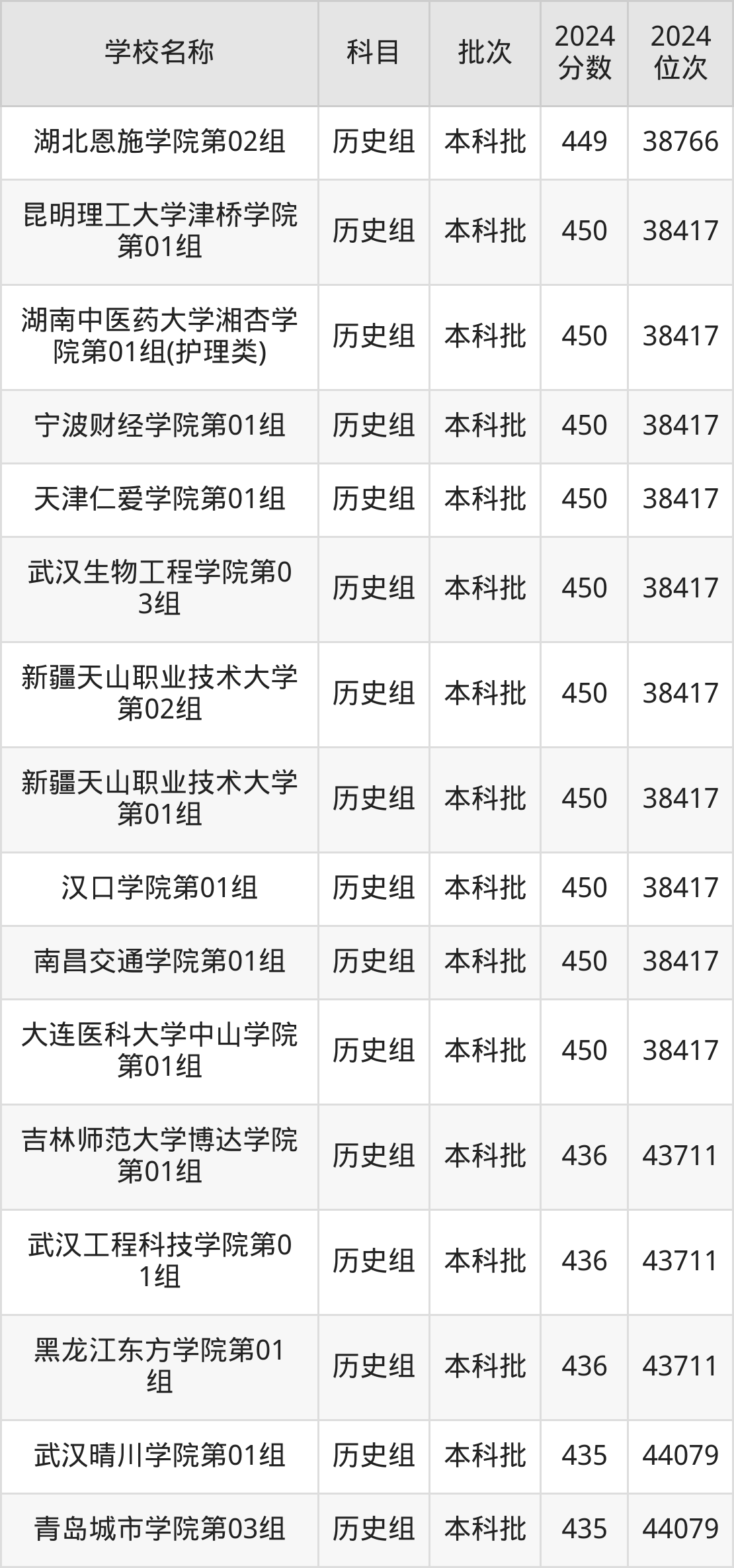 湖北高考历史组共有100所二本民办大学在410到450分之间录取,包含大连医科大学中山学院、南昌交通学院、汉口学院、新疆天山职业技术大学、武汉生物工程学院、天津仁爱学院、宁波财经学院、湖南中医药大学湘杏学院、昆明理工大学津桥学院、湖北恩施学院。