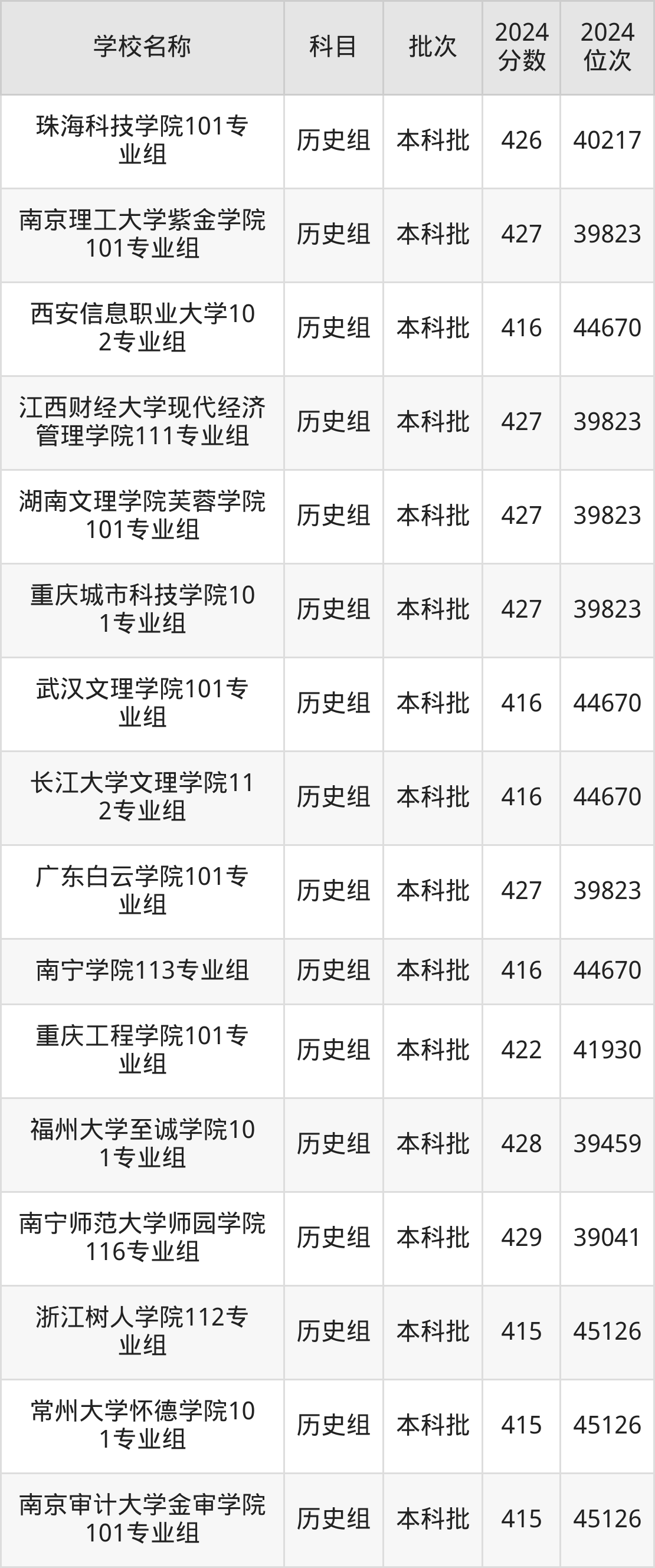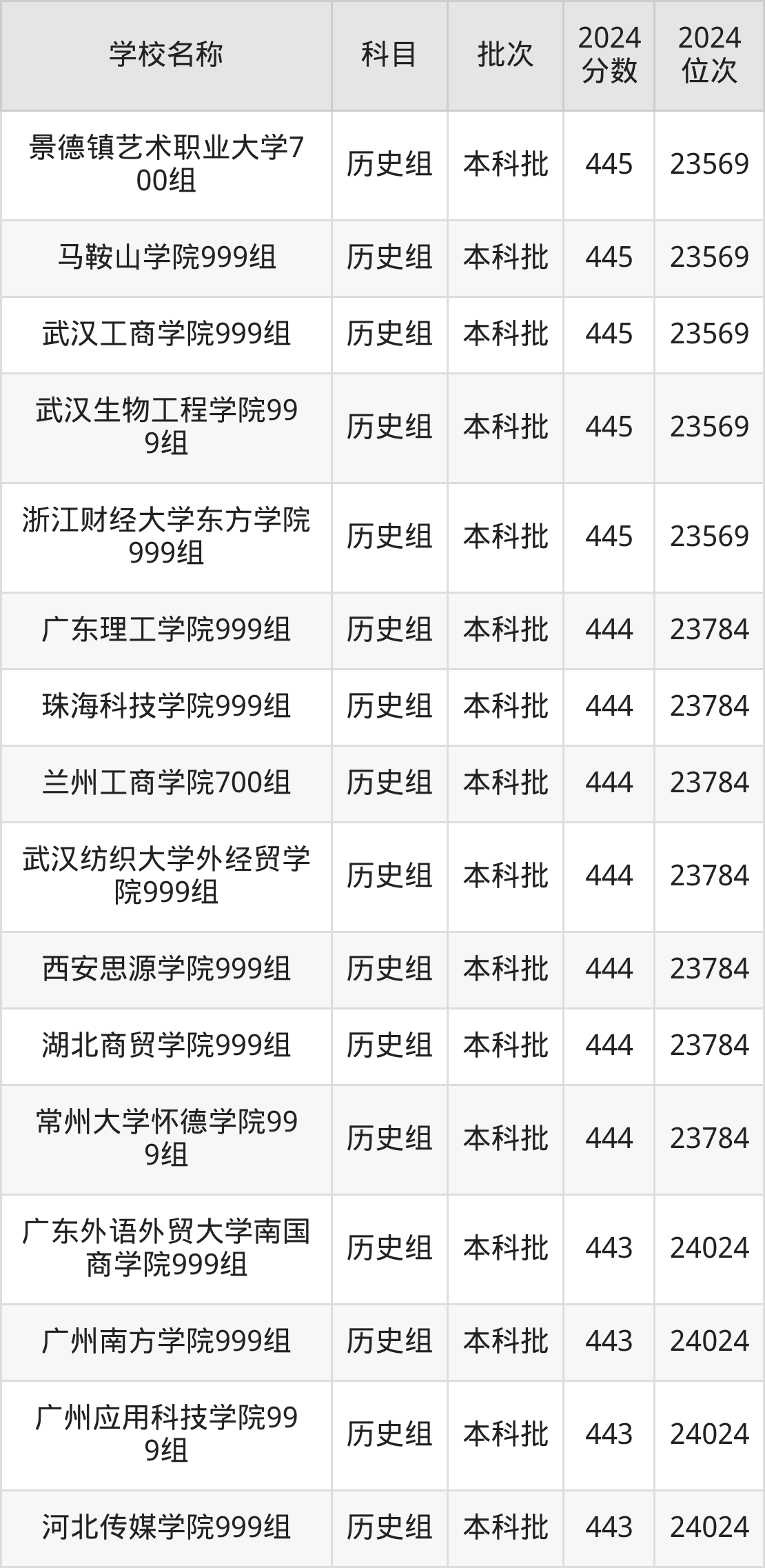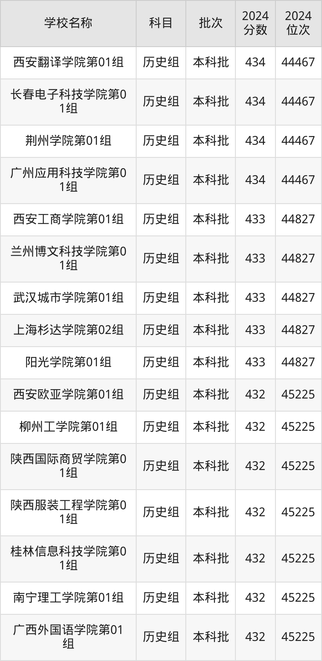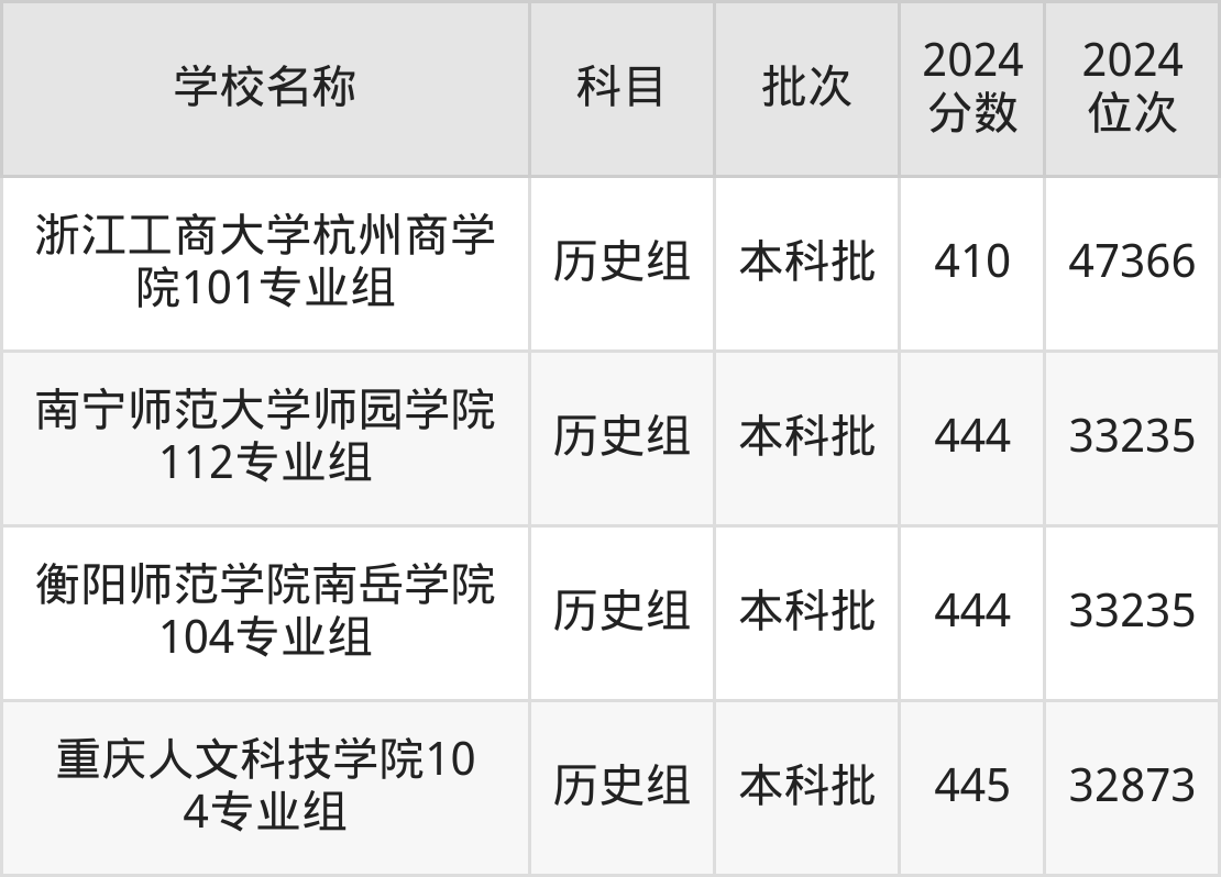 广西高考历史组共有96所二本民办大学在410到450分之间录取,包含南华大学船山学院、重庆人文科技学院、衡阳师范学院南岳学院、南宁师范大学师园学院、南昌应用技术师范学院、重庆城市科技学院、石家庄铁道大学四方学院、成都锦城学院、信阳学院、四川工商学院。