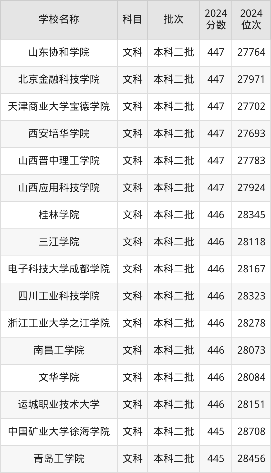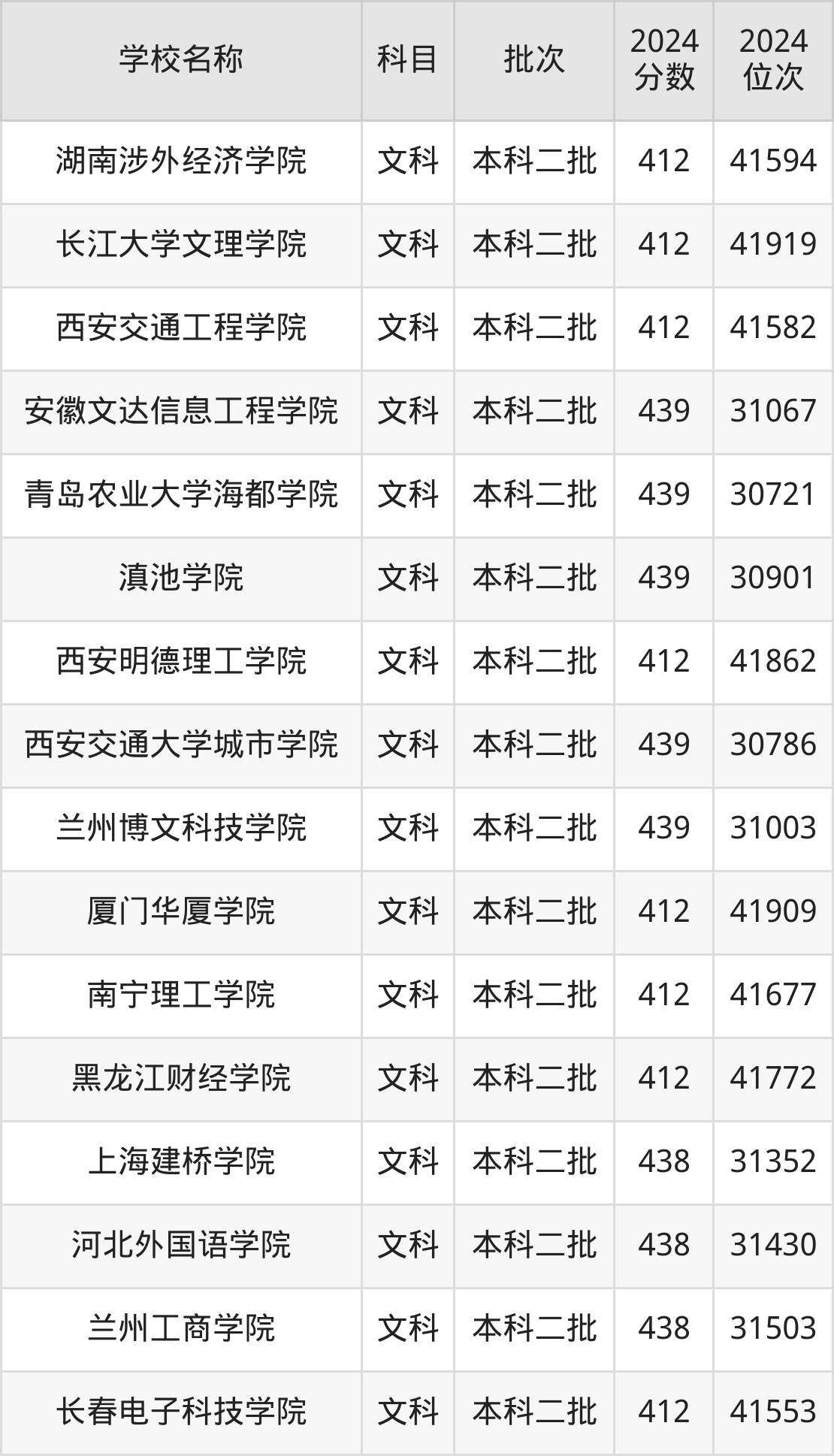 陕西高考文科共有139所二本民办大学在410到450分之间录取,包含重庆工商大学派斯学院、江西农业大学南昌商学院、集美大学诚毅学院、吉林外国语大学、珠海科技学院、山东财经大学东方学院、晋中信息学院、成都理工大学工程技术学院、齐鲁理工学院、成都外国语学院。