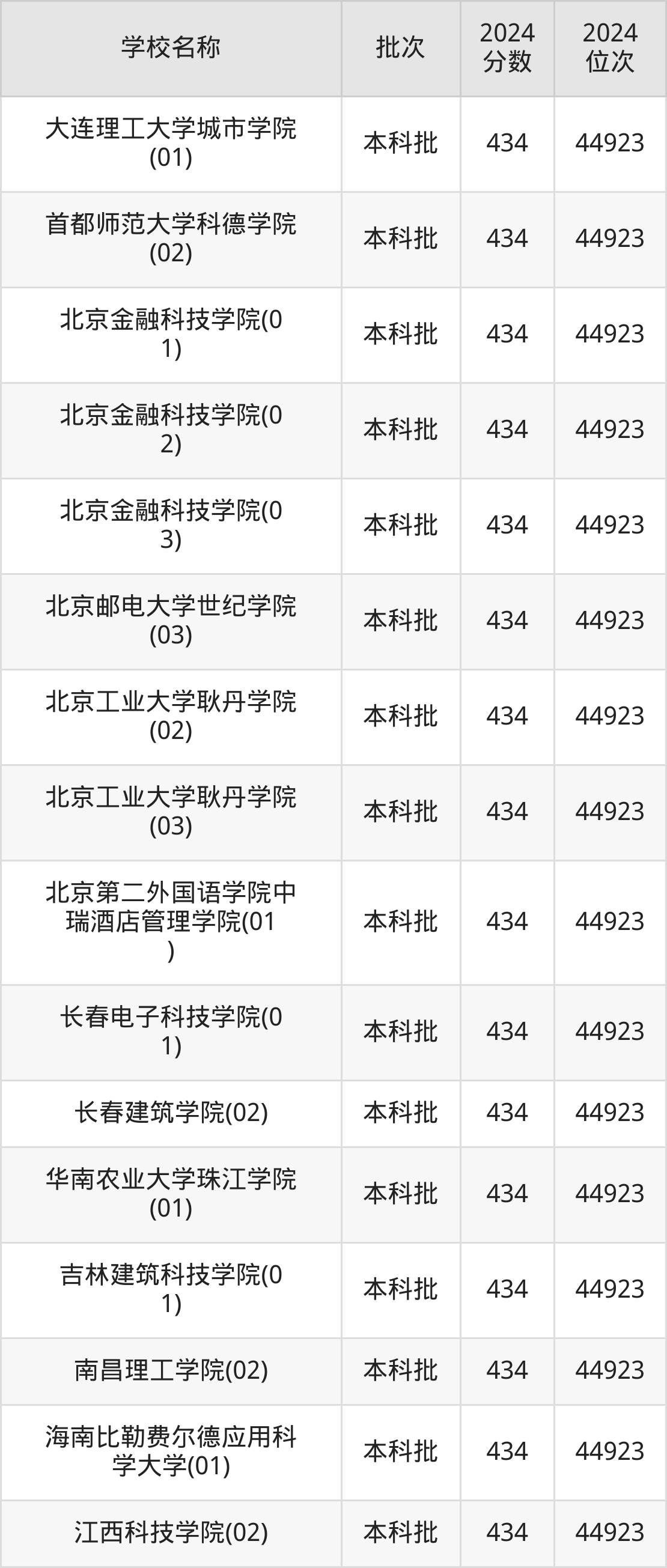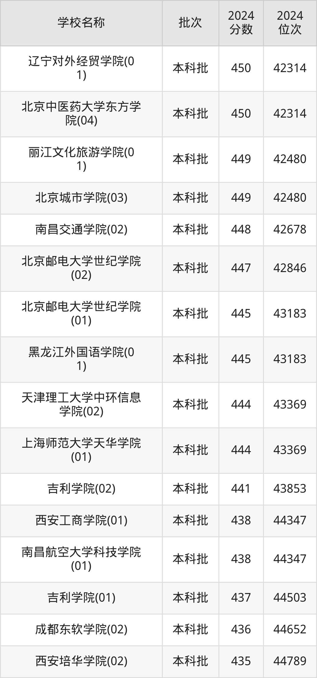 北京高考共有51所二本民办大学在410到450分之间录取,包含辽宁对外经贸学院、北京中医药大学东方学院、丽江文化旅游学院、北京城市学院、南昌交通学院、北京邮电大学世纪学院、黑龙江外国语学院、天津理工大学中环信息学院、上海师范大学天华学院、吉利学院。