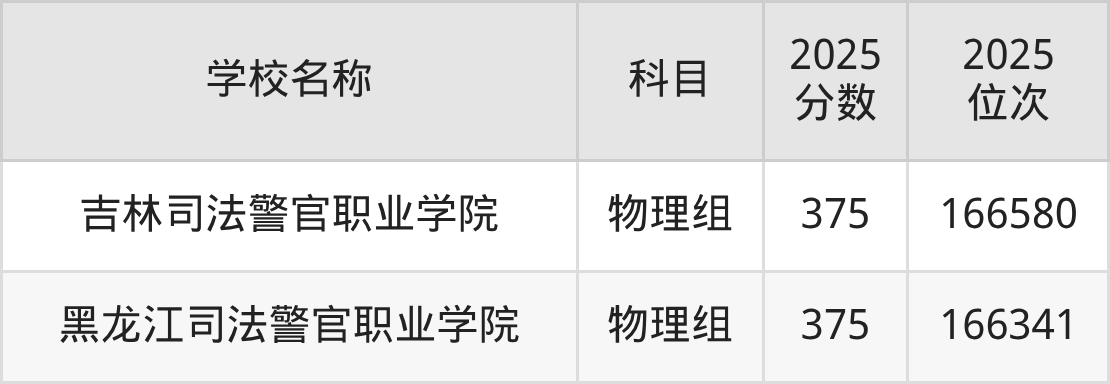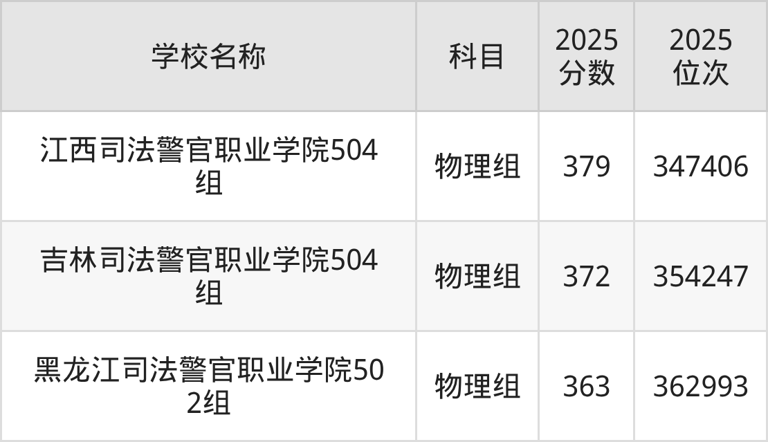 广东高考物理组共有3所公安警校在350到380分之间录取,包含江西司法警官职业学院、吉林司法警官职业学院、黑龙江司法警官职业学院。