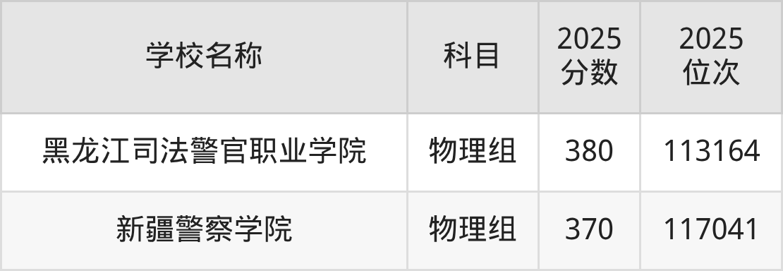 辽宁高考物理组共有2所公安警校在350到380分之间录取,包含黑龙江司法警官职业学院、新疆警察学院。