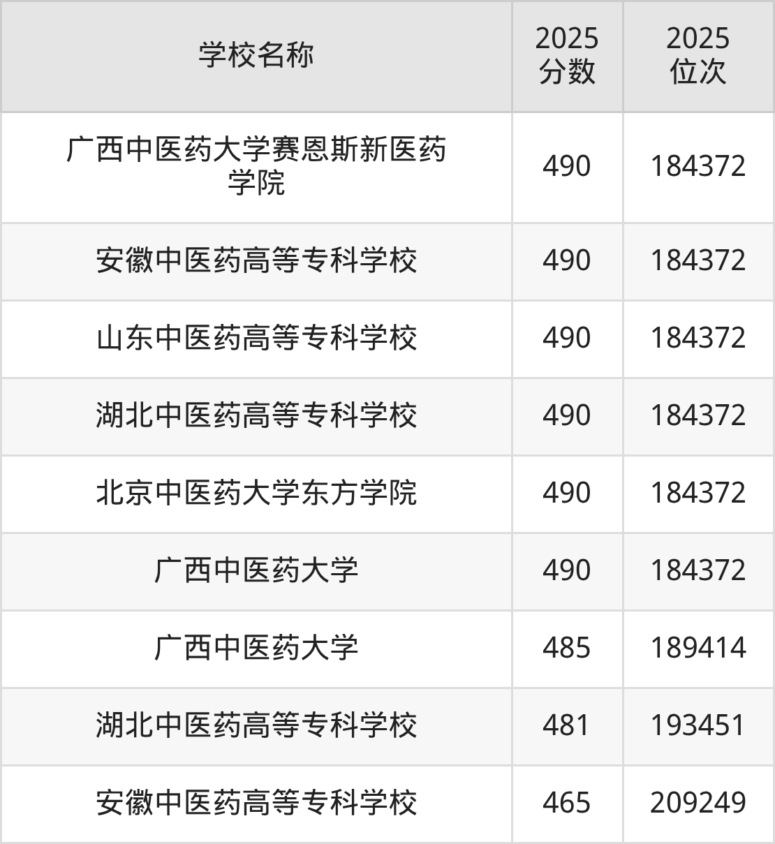 一、460到490分的中医药大学最低分一览表