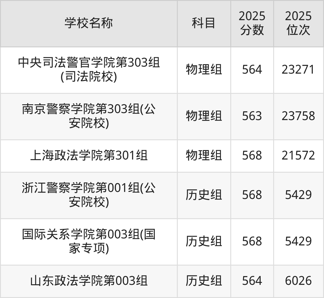 山西高考历史组共有3所二本政法大学在560到570分之间录取,包含国际关系学院、浙江警察学院、山东政法学院。