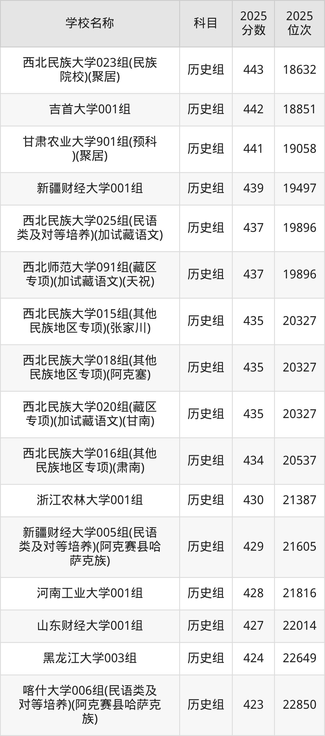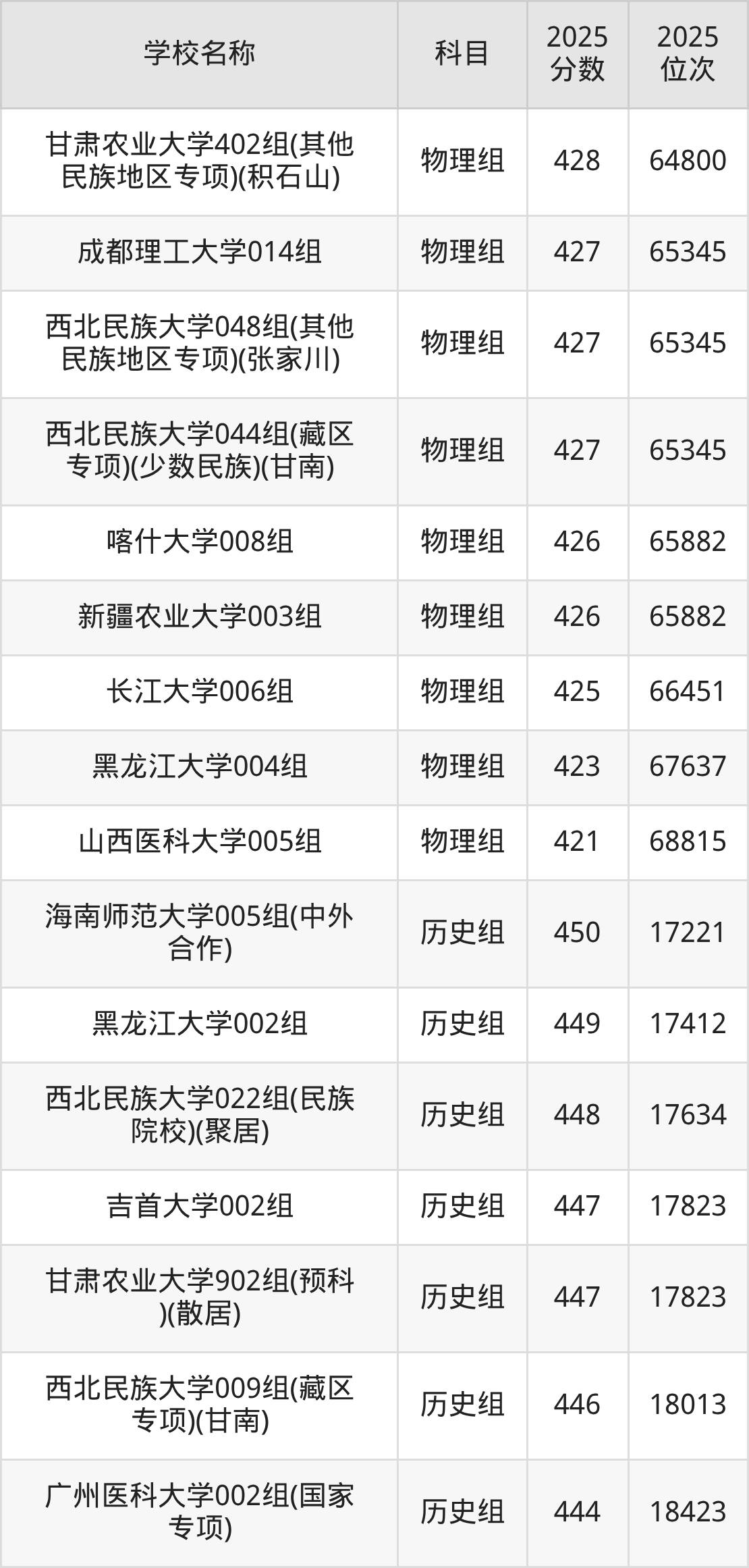 甘肃高考历史组共有14所重点大学在420到450分之间录取,包含海南师范大学、黑龙江大学、西北民族大学、吉首大学、甘肃农业大学、广州医科大学、新疆财经大学、西北师范大学、浙江农林大学、河南工业大学。