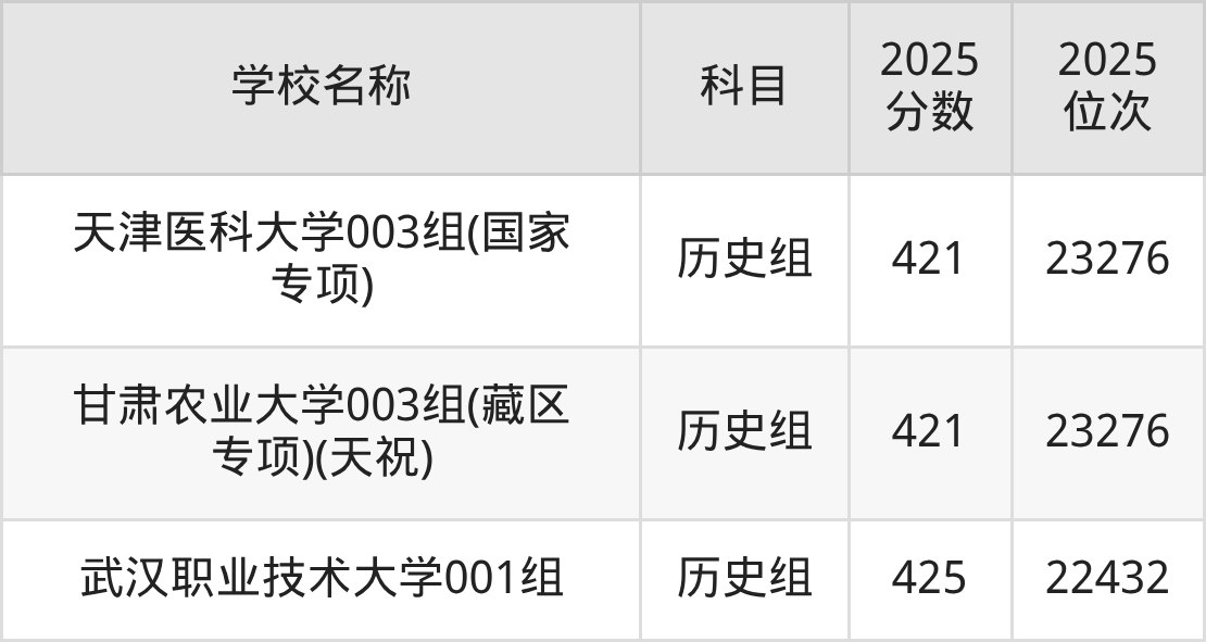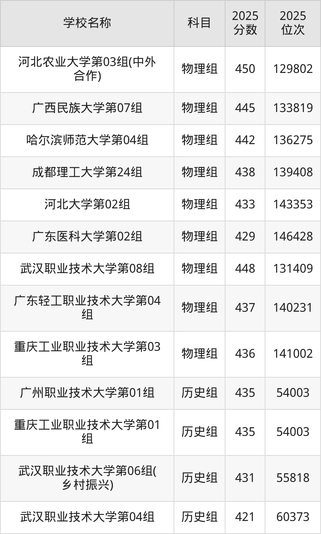 湖北高考历史组共有3所重点大学在420到450分之间录取,包含广州职业技术大学、重庆工业职业技术大学、武汉职业技术大学。